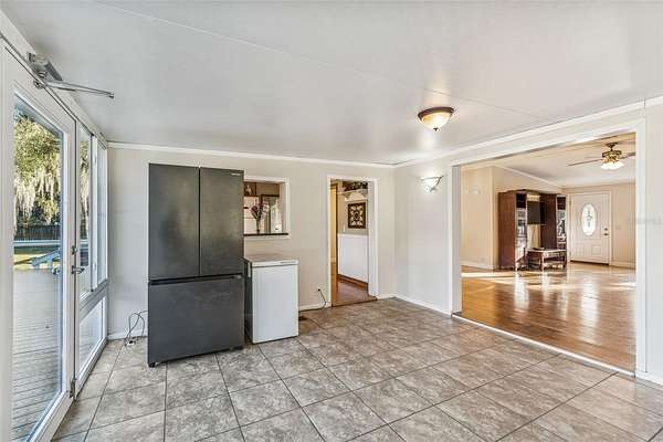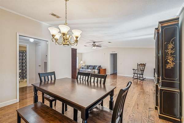 - Cathedral Ceiling(s), Ceiling Fans(s), Crown Molding, L Dining, Living Room/Dining Room Combo, Open Floorplan, Split Bedroom