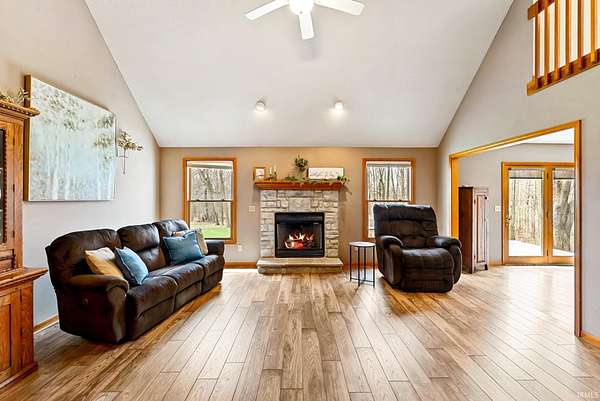 Nestled on 10.56 picturesque, wooded acres teeming with wildlife, this beautifully maintained two-story home offers the perfect blend of privacy, space, and comfort. Built just 26 years ago, the property welcomes you with a stunning lofted foyer that opens into a spacious great room featuring a striking stone fireplace and serene country views. The main level flows effortlessly into an open dining area and kitchen, ideal for both everyday living and entertaining. A French door off the dining room leads to a back deck overlooking the peaceful natural setting. The main-floor primary suite is a true retreat, offering a generous bedroom, a full bath with a jetted tub and separate shower, and a walk-in closet. An additional bedroom, half bath, and convenient laundry room complete the main level. Upstairs, you’ll find a versatile loft space along with a private bedroom and full bath—perfect for guests or a quiet getaway. The finished walkout basement provides abundant additional living space, ideal for a recreation room, home office, or hobby area, along with ample storage. Additional highlights include a three-car attached garage, asphalt driveway, and meticulously cared-for home and grounds. With a new roof installed in 2023 and move-in ready condition, this property offers a rare opportunity to enjoy peaceful country living without compromise.