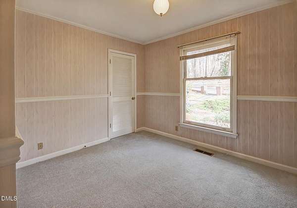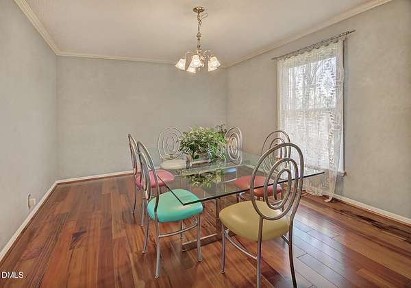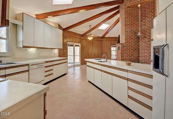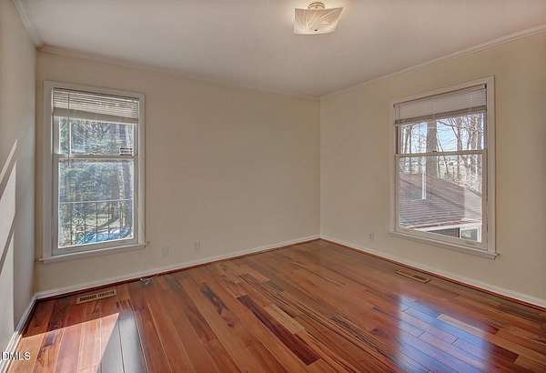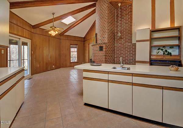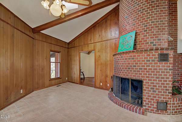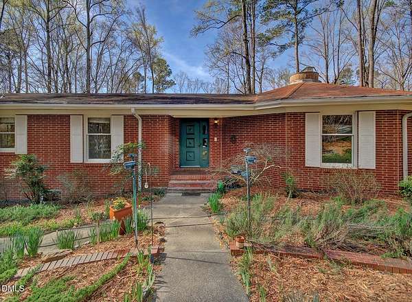 Custom Octagonal Home featuring dramatic architecture, soaring ceilings and skylights! Amazing location in South-East Durham on 2 acres. Nestled amongst mature gardens yet close to everything. 4BR/2.5BA, Garages: Detached 2-car plus attached 1-car. Walkout Basement with Workshop, Bonus, Fitness, Wine Nook, Laundry and Half Bath. Lots of sun and natural light fill the home on both levels. Flooring: Brazilian Koa hardwood in most rooms, ceramic tile, and fresh NEW carpeting. Main Level: 4BRs/2BA, Foyer, Family Room, Kitchen, Breakfast, Dining Room. Impressive architectural features abound: Octagon-shaped right portion of the home is supported by and showcases a towering circular double sided masonry fireplace . Naturally stained beamed cathedral ceiling w/skylights spirals towards the center. Very spacious Kitchen has a snack Island, tile floor, electric range w/MW, fridge, DW, desk, and access to curved Screen Porch w/Swing, beamed wood ceiling, and spectacular wooded views! Breakfast Area enjoys the curved FP. Formal DR with real venetian plaster walls overlooks back yard. Primary BR: HW floor, WICs, ensuite Bath with heated floors and soaking tub, walk-in glass & tiled shower w/linear drain, dual solid oak vanity w/granite top, mosaic tile accent above tiled lower walls. Three BRs (1 HW floor, 2 carpet) share the large Full Bath w/dual cherry vanity w/granite top, tub/shower combo, window and mosaic tile accent, HEATED tile floor and lower walls. Lower Level: Bonus Rm with walk-out access, Laundry/Half BA & Fitness/Flex Rm. NEW gas water heater (2026). Nearby Workshop, Storage, Mechanical Rooms and Single Car Garage.