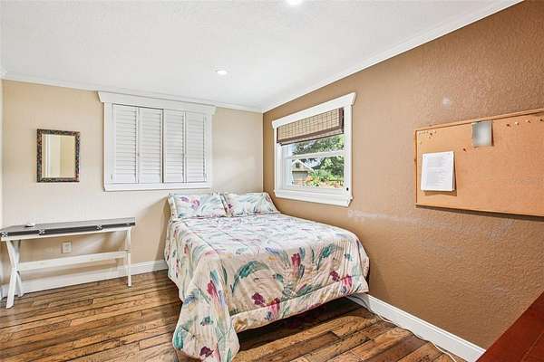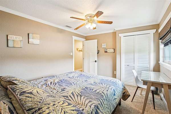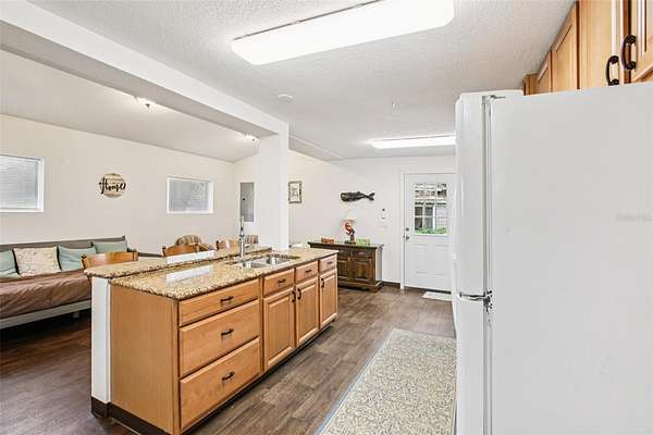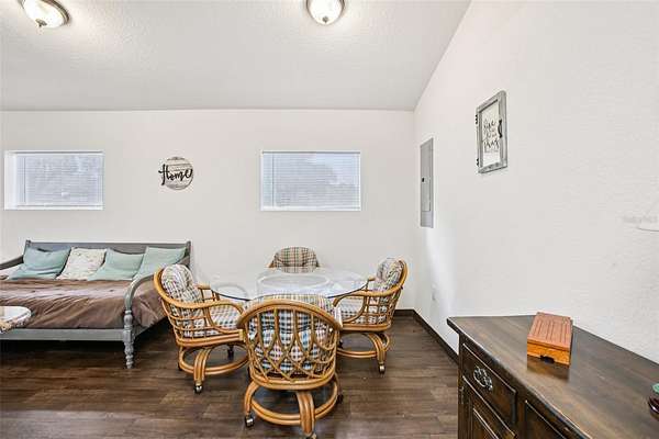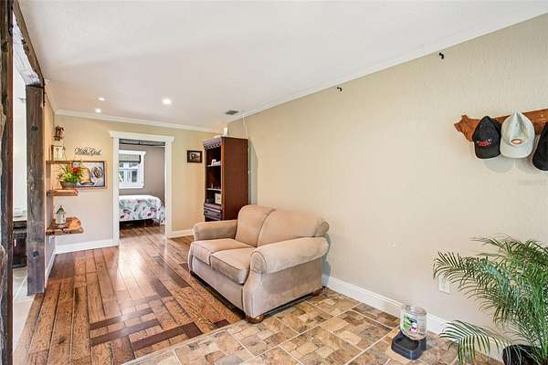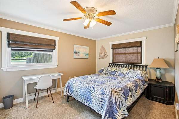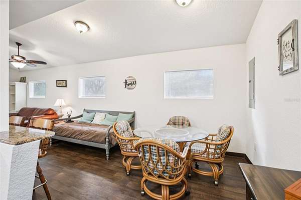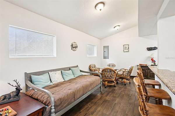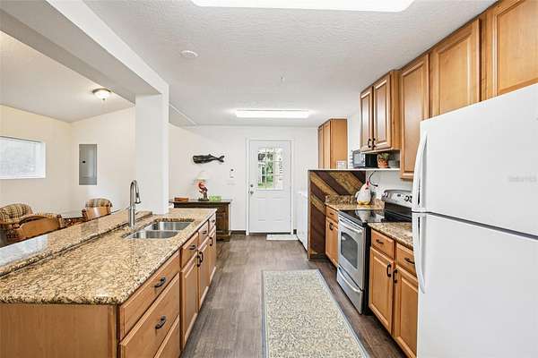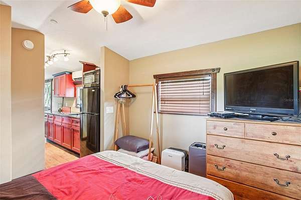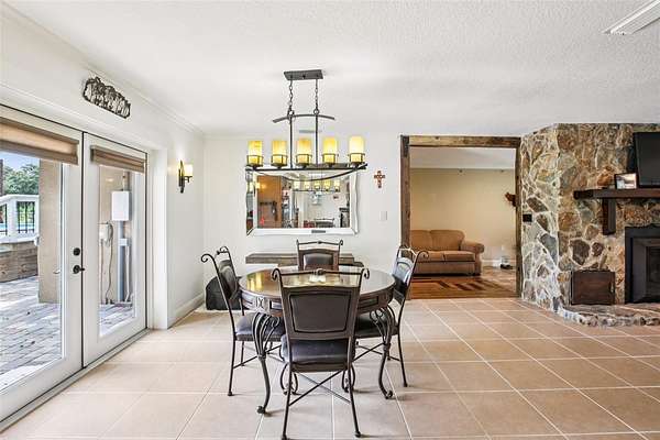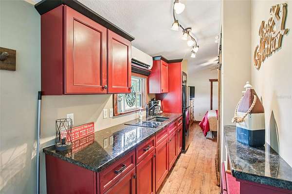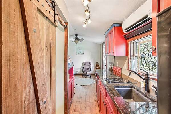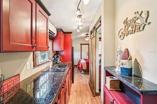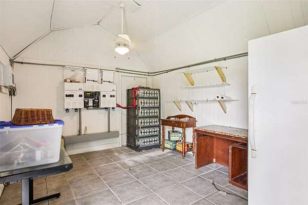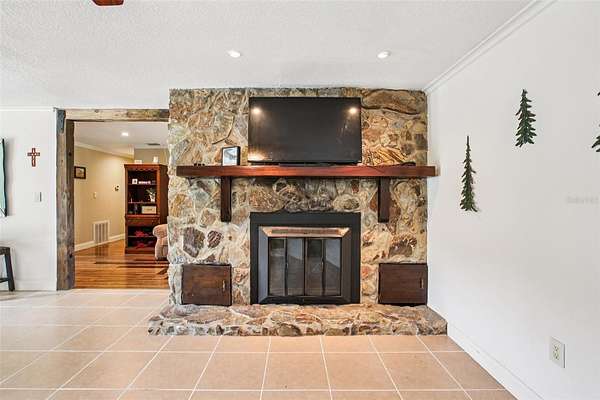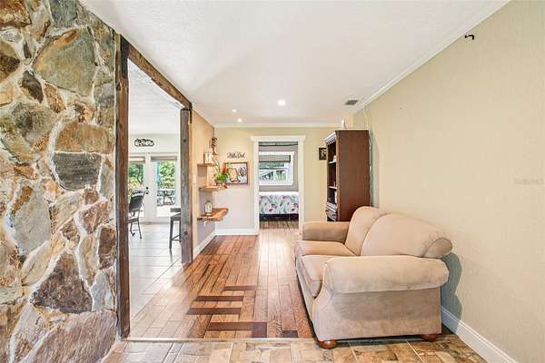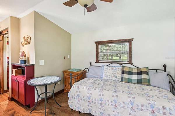 The main 3-bedroom, 2-bath home features upgraded hurricane-rated windows, a 2020 HVAC system, 30 high-efficiency solar panels, and a matching metal roof and gutter system. Inside, the warm galley-style kitchen offers stainless appliances and a 2020 gas range. The living room is anchored by a large natural Florida limestone fireplace that mirrors the custom glass front entry--a striking architectural detail. Recent additions include a light-filled sunroom and a walk-in pantry that would make any homesteader swoon.