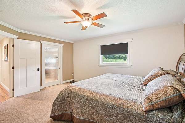 The estate also boasts serious infrastructure: a 24x40 enclosed pole barn with HVAC, hot water, two roll-up doors, shelving, and 20-amp outlets every 10 feet; a dedicated climate-controlled shed for the solar battery system; a 3-bay concrete equipment barn; an RV pad with 50-amp service and water; a 20kw Generac whole-house generator; a 500-gallon gas tank with pump; and underground electric.