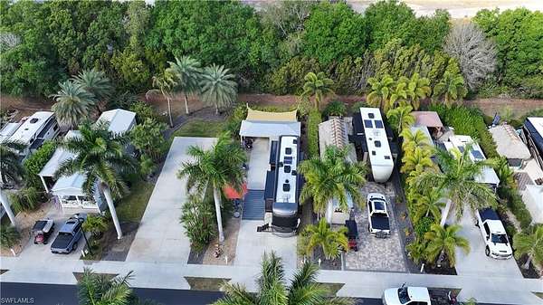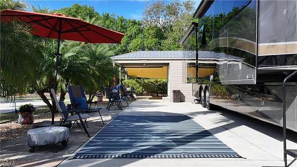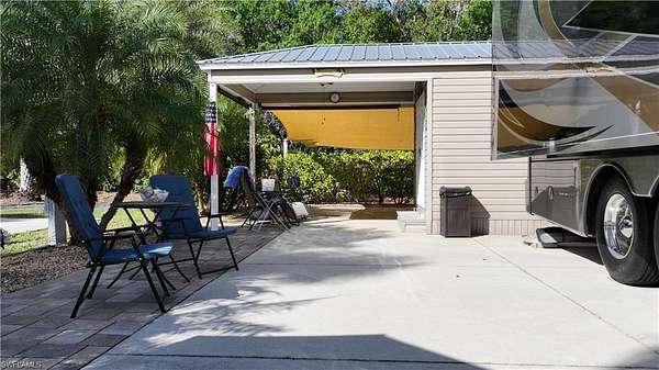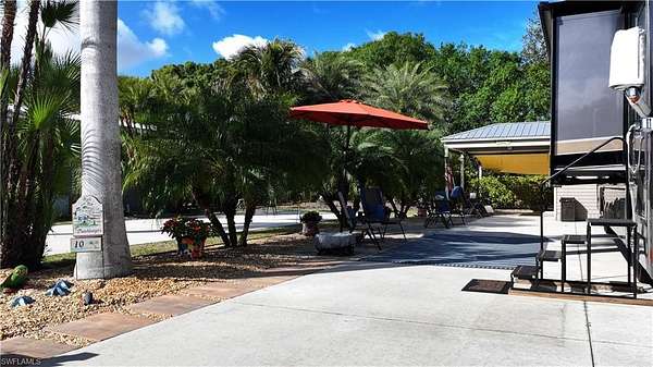 Welcome to Site 10 in highly desirable Cypress Trail RV Resort in Fort Myers. Priced at $169,999, this 35' x 90' (3,150 sq ft) RV lot offers the perfect blend of privacy, functionality, and tropical charm. The concrete pad is in excellent condition and is complemented by additional pavers surrounding the property, creating expanded outdoor living and entertaining space. A lush variety of mature tropical foliage frames the lot, providing a private, resort-style setting. The fully finished accessory building is thoughtfully designed with relaxed beach-inspired finishes and includes a washer and dryer, refrigerator, shower, and toilet-offering exceptional convenience for seasonal or extended stays. An extended roof line provides additional shaded outdoor space, while a massive shade cover at the rear of the property enhances comfort and usability year-round. Quarterly HOA dues are $975. This well-appointed property is ideal for those seeking a move-in ready RV lot in one of Fort Myers' premier RV resorts.