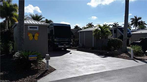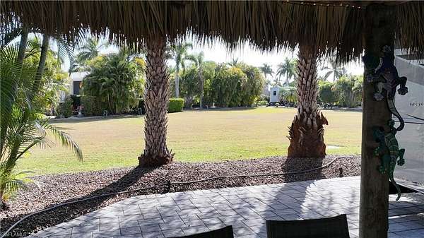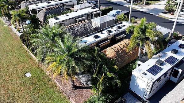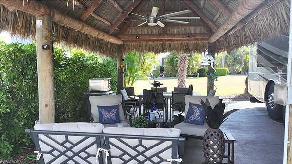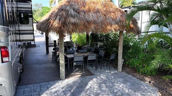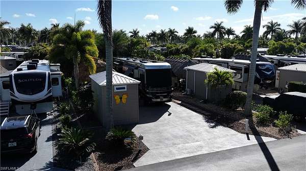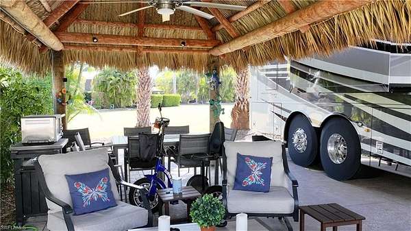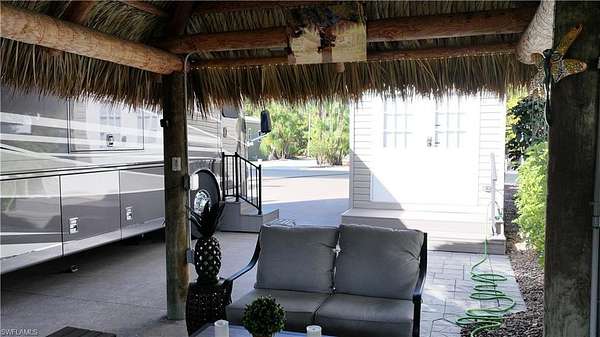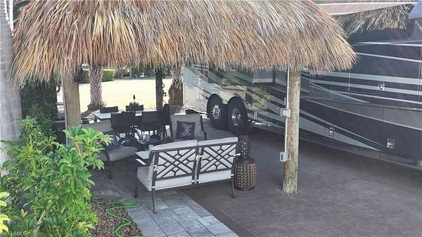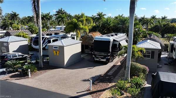 Experience exceptional outdoor living at Site 160, a beautifully landscaped RV lot located in one of Fort Myers' most desirable luxury RV resorts. This spacious property offers privacy, mature tropical landscaping, and an impressive entertaining setup. The lot is surrounded by established Sylvester, Calusa, and Royal palms along with additional tropical foliage, creating a lush and private setting. An oversized tiki hut - recently rethatched and equipped with electric - serves as the focal point of the property, providing a generous shaded space ideal for relaxing or entertaining. The site backs to a large common area, offering added privacy with no immediate rear neighbors and open green space views. The painted concrete pad is in excellent condition and complemented by extended pavers, expanding the usable outdoor living area. An accessory building on the property provides a blank canvas for customization, allowing the next owner to design and finish the space to suit their needs. With strong value, mature landscaping, and outstanding outdoor living features, Site 160 presents an excellent opportunity to enjoy the Florida RV lifestyle in a well-maintained, amenity-rich community.