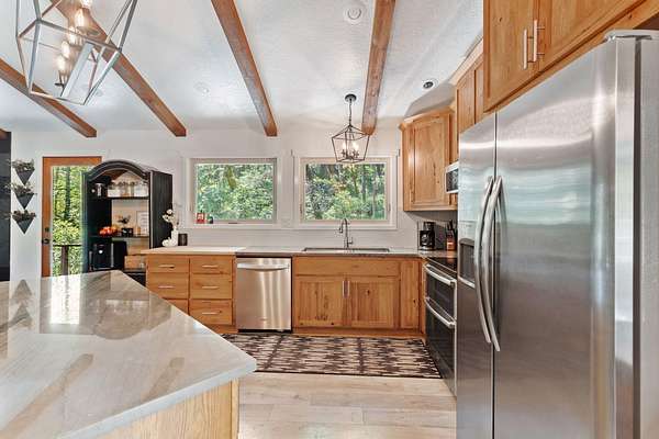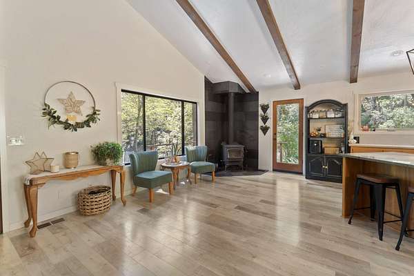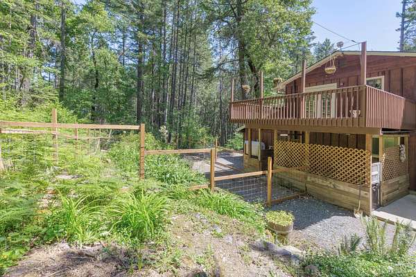 A private retreat is set on 3.25 wooded, semi-private acres where comfort, flexibility, and lifestyle come together. This custom 2,140 SF home features an open floor plan with soaring vaulted ceilings that create an airy feel throughout. Updates include a beautifully remodeled kitchen with Quartzite countertops, hickory cabinets, and stainless steel appliances, along with new carpet, travertine tile, and laminate flooring. A cozy wood stove capable of heating the entire home anchors the living space, perfect for cool Southern Oregon evenings. Upstairs, the spacious primary bedroom offers privacy and an ensuite full bath. What truly sets this property apart is the massive 40x40 shop, complete with an enclosed bedroom, full bathroom, and upstairs storage, ideal for hobbies, guests, multi-generation living, or potential two-family setup. RV parking with hookups adds even more versatility. Enjoy natural landscaping, including plum and fig trees. This is not just a home, it's a lifestyle.