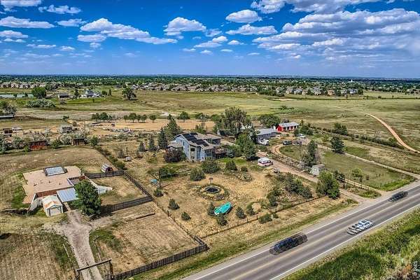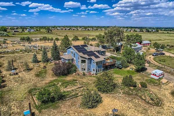 Enjoy true Colorado living on 1.5 acres with stunning Front Range views, no HOA, no Metro District, and rare FA1 zoning-bring your horses, goats, and chickens. Located just 5 minutes from I-25, this property offers peaceful country space with easy access to everything.This versatile 5-bedroom, 3-bath home is ideal for multi-generational living, featuring a fully finished walk-out basement with private entrance, full kitchen, family room, two bedrooms, and a 3/4 bath-perfect for extended family or rental potential.The light-filled great room showcases soaring ceilings, expansive windows framing the mountains, and a gas fireplace. The updated kitchen features quartz countertops, farmhouse sink, wall ovens, gas cooktop island, and two-tone cabinetry. A main-level bedroom and full bath add flexibility, while upstairs offers two bedrooms, a loft, and another full bath.Enjoy sunsets from the spacious upper deck or relax on the shaded patio below. Additional highlights include owned solar, newer roof and HVAC, oversized garage, RV parking, and mature landscaping.A rare blend of acreage, views, and flexibility-ready for modern Colorado living.
