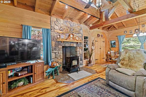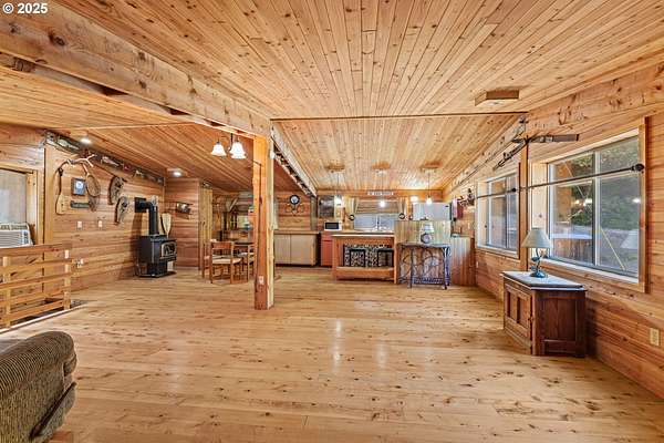 Charming Rustic Retreat with Studio Apartment, Cabins & More!This unique and versatile property offers a perfect blend of comfort, functionality, and rustic charm. Step inside the main living space featuring beautiful Myrtlewood floors and a striking vaulted beam ceiling that adds warmth and character throughout.The property includes a 24x32 shop building with a cozy upstairs studio apartment-ideal for guests, rental income, or your own private retreat. Just steps away, you'll find two sleeping cabins and a well-equipped laundry/shower/restroom complex, providing ample accommodations for visitors or extended stays.A classic party barn, styled with rustic decor and furnished with antiques (many of which will stay), is perfect for entertaining or hosting unforgettable gatherings. Additional features include a 16x40 RV shelter and a cozy guest or craft room that offers flexible use.Whether you're looking for a private getaway, a creative compound, or a potential income-producing property, this charming estate offers endless possibilities in a serene setting.
