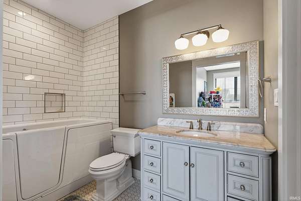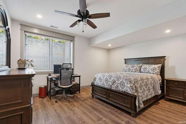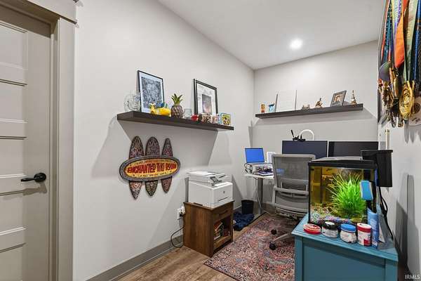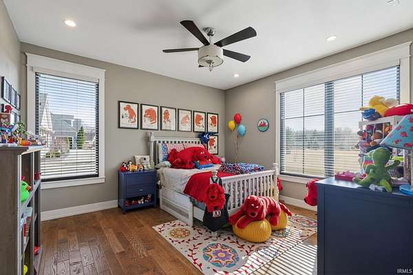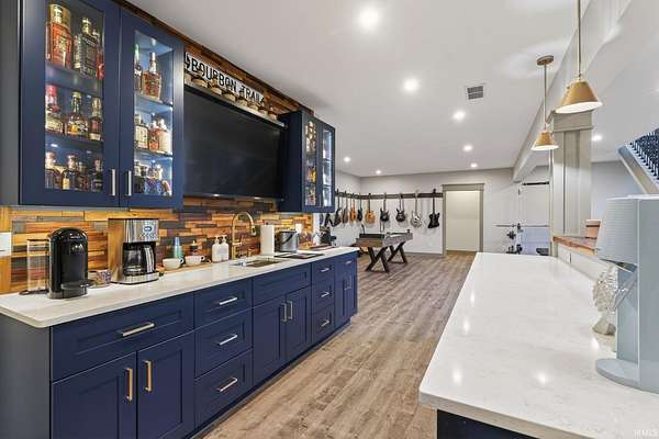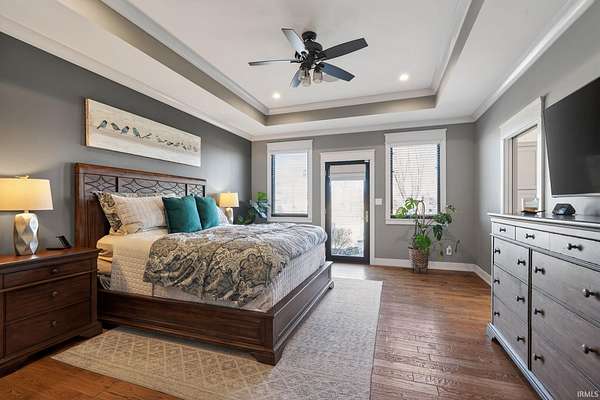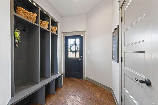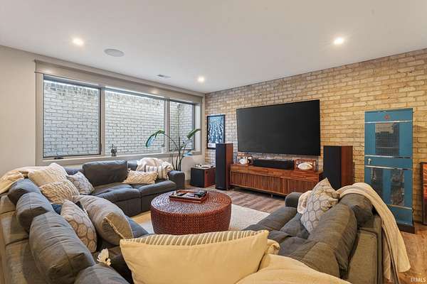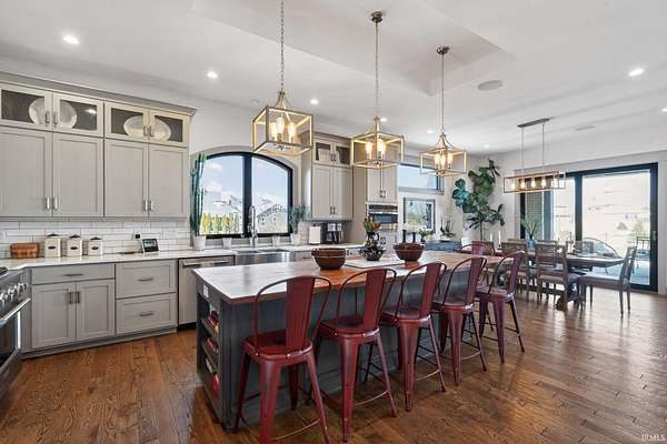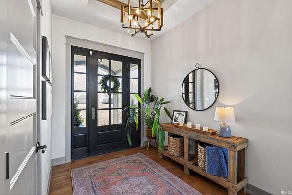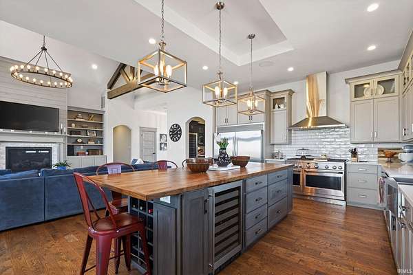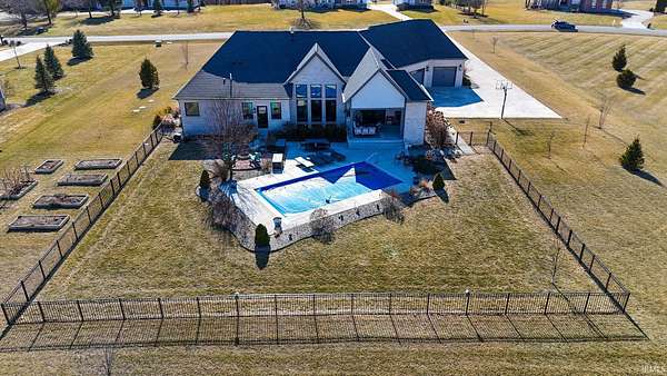 ABSOLUTELY STUNNING CUSTOM BRICK RANCH WITH A FULL FINISHED BASEMENT, RESORT-STYLE POOL, AND NEARLY 5,000 FINISHED SQUARE FEET SET ON A BEAUTIFUL 1.63 ACRE LOT. Offering the perfect blend of peaceful country living and everyday convenience, this exceptional home is ideally located just minutes from SR 43N, I-65, Purdue University, West Lafayette shopping, parks, and is within the highly regarded Tippecanoe School Corporation district serving Battle Ground Elementary, Battle Ground Middle, and Harrison High School. Situated in an upscale neighborhood known for its spacious homesites, the property offers a private and expansive setting with a portion of the yard enclosed by a black metal fence surrounding the impressive outdoor entertaining area. The backyard showcases a stunning 16’ x 32’ in-ground pool surrounded by a large concrete patio, firepit gathering area, covered porch, and outdoor kitchen, creating an ideal space for relaxing or entertaining while enjoying views of the beautifully landscaped grounds. Inside, the home features a welcoming foyer with tray ceilings and crown molding that leads to a breathtaking great room highlighted by soaring vaulted ceilings with exposed decorative wood beams and trusses, an oversized custom fireplace with raised brick hearth, tile surround, custom mantel and shiplap extending to the ceiling, all framed by built-in bookcases. The great room flows seamlessly into the gourmet kitchen featuring an oversized island with custom cabinetry, beverage cooler, butcher block countertop with bartop seating, custom Zinn cabinetry with stacked cabinets to the ceiling, quartz countertops, tiled backsplash, farmhouse stainless sink, high-end appliances including a side-by-side column refrigerator and freezer, and a 48-inch gas range with vented hood. The kitchen opens to a spacious dining area with an impressive 8’ x 8’ sliding door leading to the outdoor patio while also overlooking the striking double-sided open railing staircase and dramatic wall of floor-to-ceiling windows that extend from the great room down to the basement level, filling the home with natural light. Just off the kitchen are thoughtfully designed functional spaces including a butler’s pantry with a large wine and beverage cooler, a spacious mudroom with custom lockers and cubbies, and a large laundry room featuring abundant cabinetry, folding area, and dual stacked washers and dryers, along with a convenient half bath.
