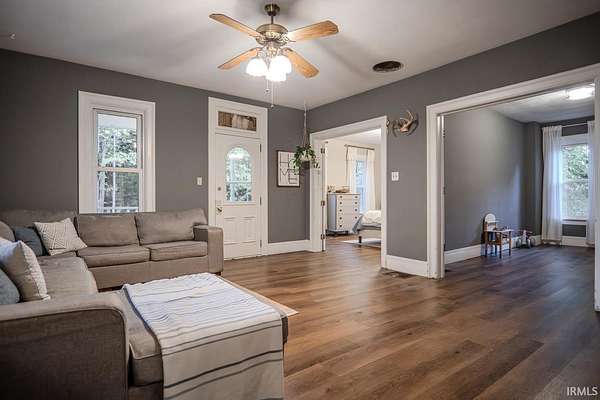 If you dream of country living yet desire a convenient location, this home may be just what you've been looking for! Full of character, this farmhouse features a large wrap-around porch, a classic barn, and a silo -- all set on 6.81 beautiful acres and comes with your very own zipline for outside enjoyment. Inside, you'll find a spacious kitchen with built-ins, a quartz island, and plenty of room for gatherings in the large eat-in area. Updates include a new furnace, A/C, water heater, and water softener -- all replaced in 2024. The home boasts soaring ceilings, transom windows, and a front door with stained glass detailing. The main floor offers a generous living room that opens to two additional flexible rooms -- perfect for an office, formal dining, or extra bedrooms -- along with a convenient laundry/mudroom. Upstairs, you'll find three large bedrooms and a full bath. Enjoy peaceful mornings and relaxing evenings on the expansive wrap-around porch, or unwind in the screened-in area.