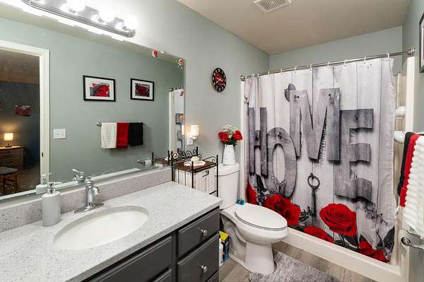 - Breakfast Bar, Ceiling Fan(s), Fiberglass Stall Shower, Laminate Counters, Open Floorplan, Pantry, Primary Downstairs, Shower/Tub Combo, Walk-In Closet(s)