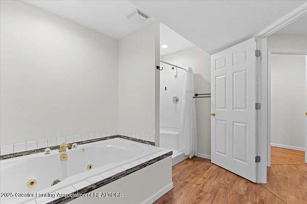- Ceiling Fan(s), Double Vanity, Eat-In Kitchen, Open Floorplan, Pantry, Primary Downstairs, Recessed Lighting, Smart Thermostat, Soaking Tub, Stone Counters, Vaulted Ceiling(s), Walk-In Closet(s)