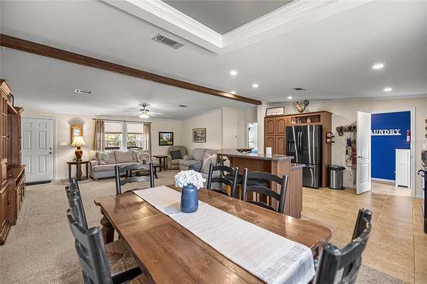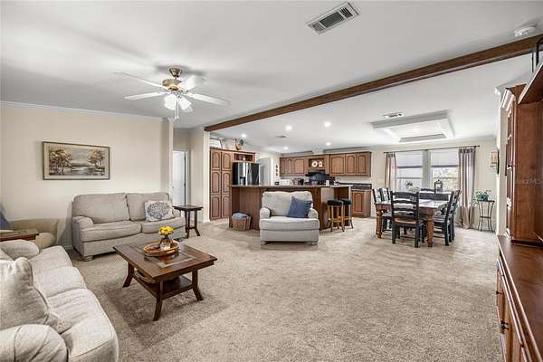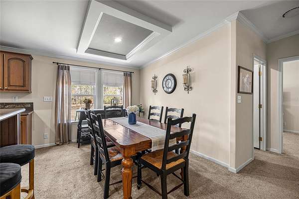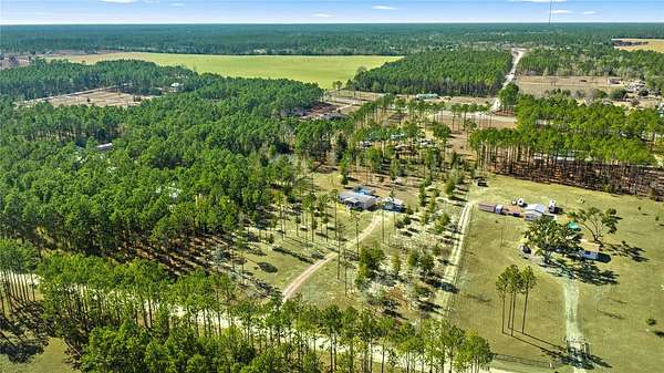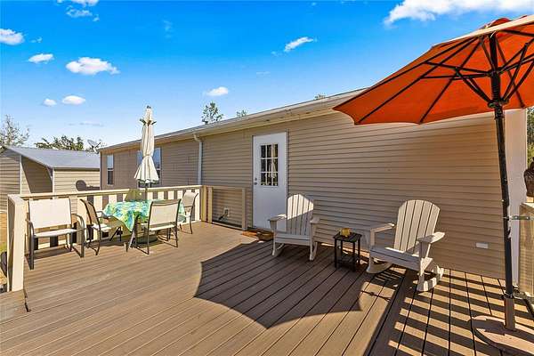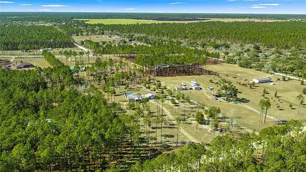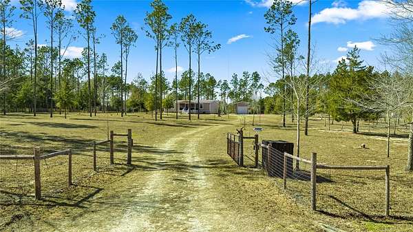 Your Slice of Paradise awaits on this 5-Acre Countryside Retreat! Located in a horse-friendly community surrounded by natural beauty, the property features a 3 Bed/2 Bath 2017 Double Wide by Palm Harbor, a new swimming pool, and tons of upgrades. Central to Dunnellon and Ocala, a short drive from Goethe State Forest, Black Prong, and World Equestrian Center. An electric gate, scenic pine trees, and a screened-in front porch welcome guests into this charming homestead. Step into an open-concept layout accented with crown molding and abundant natural light, creating an elegant, warm, and inviting atmosphere. A spacious living room opens to a bright modern well appointed kitchen with a custom walk-in pantry, ample cabinetry, and center island with a raised bar. The master suite features a walk-in closet and a remodeled luxury en-suite boasting a captivating glass enclosed tile shower providing a peaceful retreat. Laundry/utility room with access from kitchen and rear exit door. The poolside provides a cozy outdoor escape and breathtaking views ideal for relaxing or entertaining guests. The metal carport-shed combo is perfect for all your tools and toys. Featuring a central, enclosed storage area with electrical hookup and a 12' bay roll-up door flanked by two separate open-sided covered parking spaces with plenty of room for your autos, RVs, boats, campers, and travel trailers. The home is equipped with a newly added whole-house water filtration system. The central AC heat pump package unit is only six months old and includes a 10-year all-parts warranty with first-year labor coverage. The grounds are enhanced with self-sustaining, easy-care landscaping via an automated irrigation system serving the entire property. Your dream mini farm awaits away from it all but close to everything. NO HOA, NO Flood Zone!