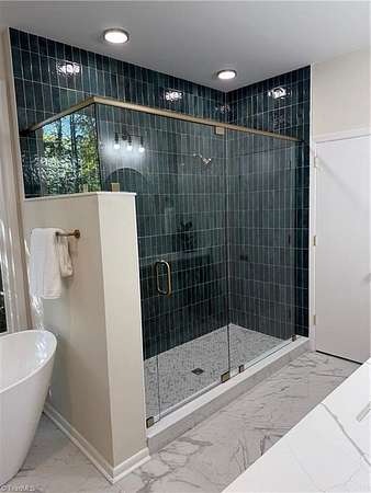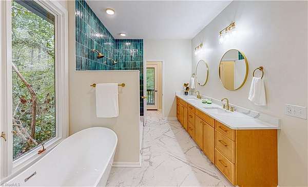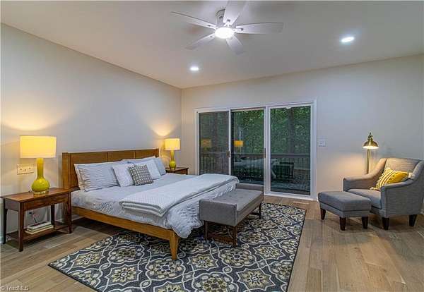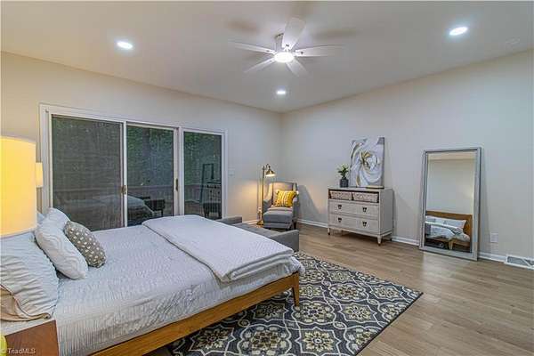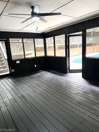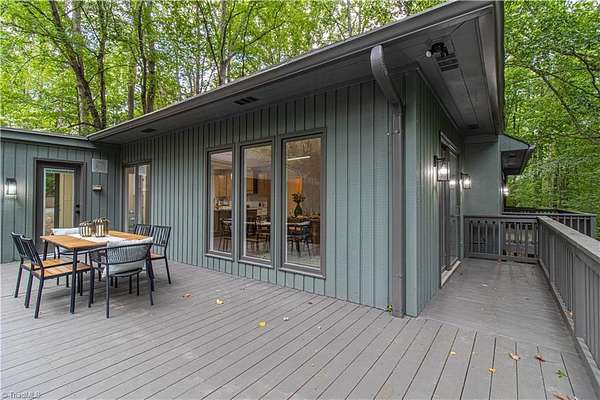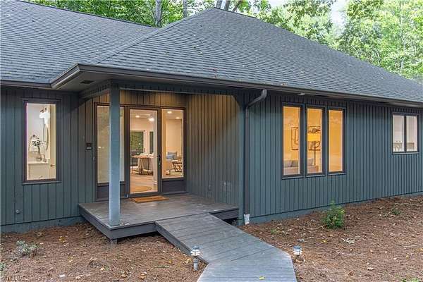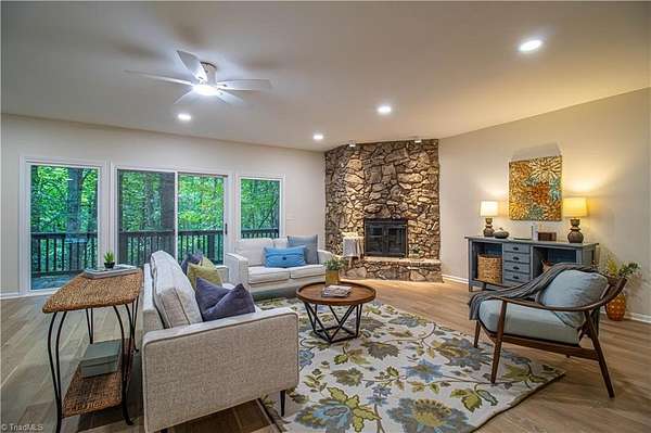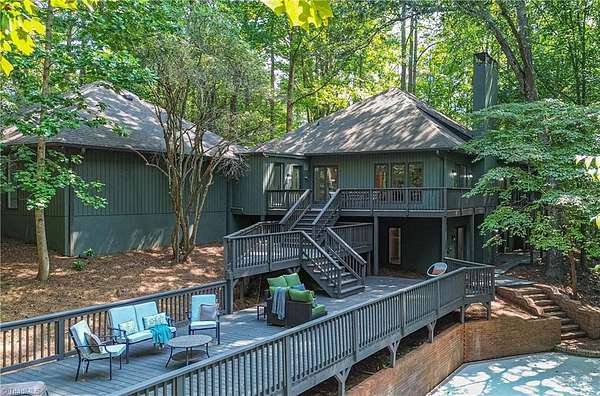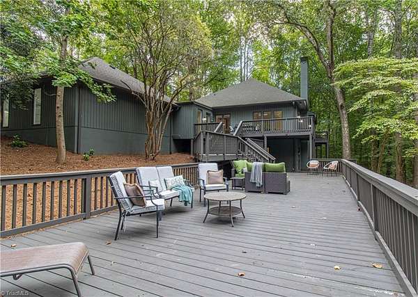 Welcome to this beautiful, well built and meticulously remodeled home perfectly nestled on 5 acres in Lewisville, NC. Step into a gorgeous open Living room featuring a stone FP and large windows offering beautiful views of the retreat setting. Large eat-in kitchen and keeping room with upscale SS appliances, sleek cabinetry and quartz countertops make a great space for gatherings. Main level primary has its own private deck and all new bath w soaking tub, over sized tiled shower & features high end fixtures and lrg custom closet. ML also features an office with paneled feature wall and built in shelving. 3 real stone fireplaces add to the charm of this amazing property. 4 BR, 2 baths and Den/Rec space make up the completely finished walk out basement. Beautiful pool, multi level decking and pool house offer lots of outdoor living space. Pool house has 1/2 bath and plenty of space for entertaining and storage. 2 garages w space for 5 cars have attics above offering tons of storage.
