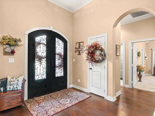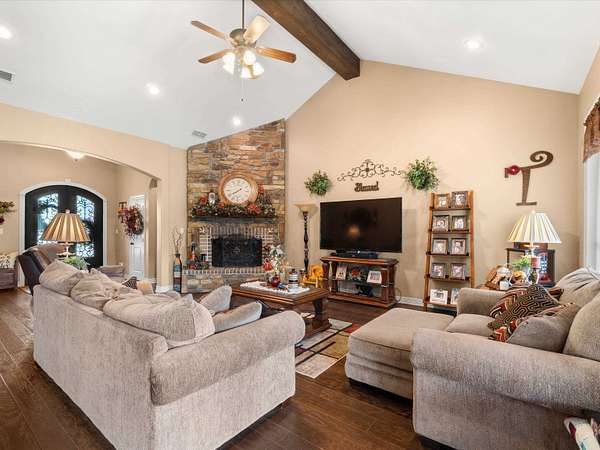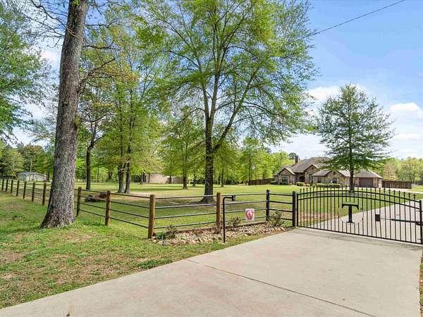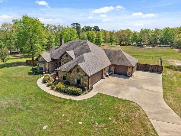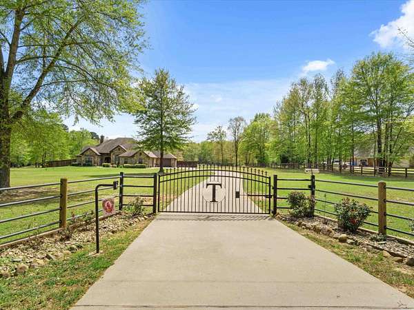 Welcome to this beautifully maintained 4-bedroom, 3-bath brick home just minutes from Gilmer, offering the perfect blend of comfort, space, and functionality. From the inviting curb appeal and expansive cement drive to the electric gated entry and fenced backyard, this property is designed for both privacy and convenience. Inside, you’ll find a spacious, open-concept layout featuring a large living room anchored by a stunning wood-burning fireplace, seamlessly flowing into the breakfast area and kitchen complete with a breakfast bar and wine fridge—perfect for entertaining. A formal dining room adds elegance for special gatherings. The split-bedroom design includes generously sized rooms with walk-in closets, a convenient Jack and Jill bath, and a luxurious primary suite featuring dual sinks, vanity space, a jetted tub, and ample room to unwind. The well-appointed laundry room includes a sink for added functionality. Step outside to enjoy a large covered patio with an attached gazebo extension, ideal for relaxing or hosting guests year-round. Car enthusiasts or hobbyists will appreciate the 3-car garage, including one bay that is completely separated. Move-in ready and thoughtfully designed, this home offers everything you need in a peaceful setting on 5 acres and just minutes from town.