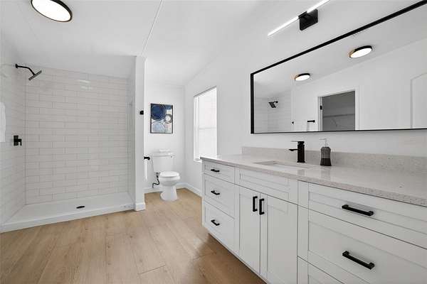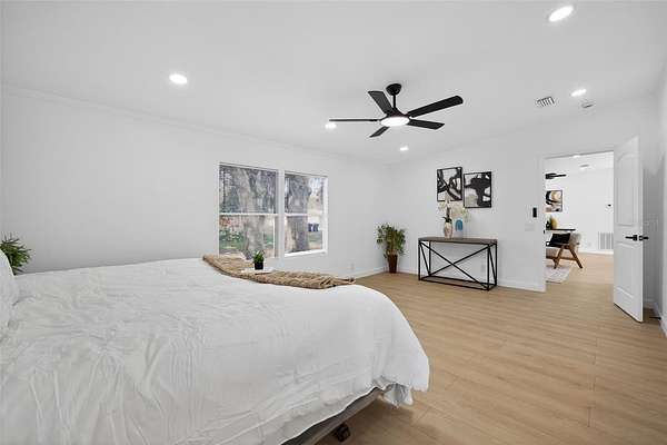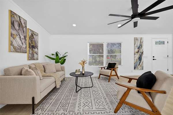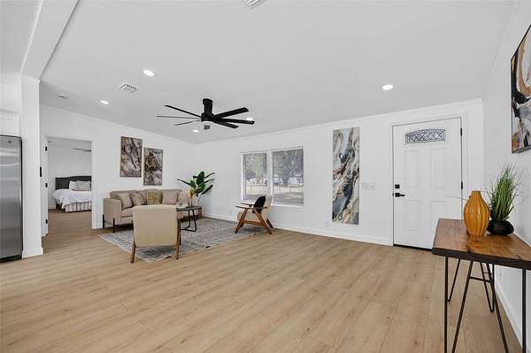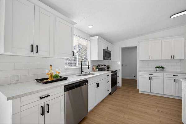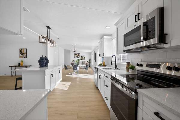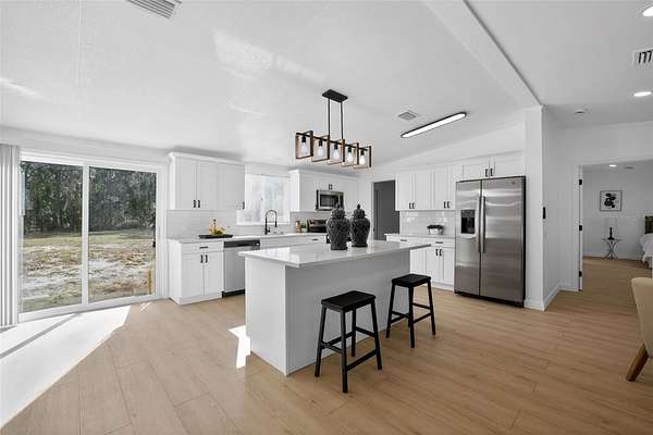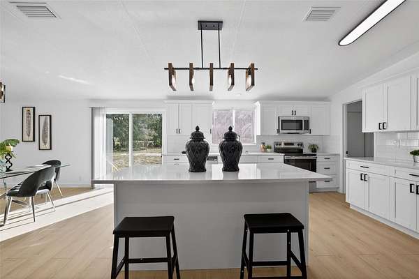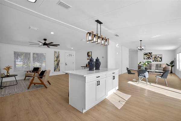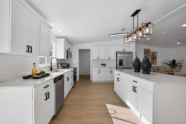 Absolutely stunning, 4 bedroom/2 bathroom fully-remodeled manufactured home with modern and tasteful finishing touches, situated on a WHOPPING 1.91 ACRES of land with NO HOA or lot rent! The large, blank canvas of a yard is ready for your personal touches to create your dream outdoor space. Inside you'll find an open layout with a split floor plan, vinyl flooring throughout the home, NEW interior paint. Sleek new fixtures throughout, such as ceiling fans, lights and more. ALL NEW beautiful kitchen has never-used cabinets and quartz countertops, brand-new stainless-steel appliances and a lovely island with barstool seating. Spacious master bedroom features a remodeled ensuite with a retiled stand-in shower, new, huge vanity, new mirror, toilet and other fixtures AND a walk-in closet. Other hall bath also fully remodeled. NEW 2025 ROOF, NEW 2025 HVAC!! Schedule a showing now!