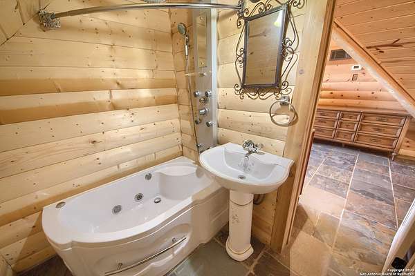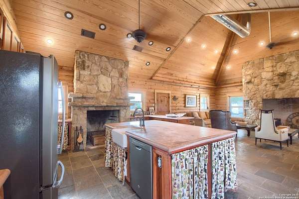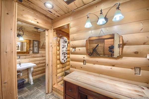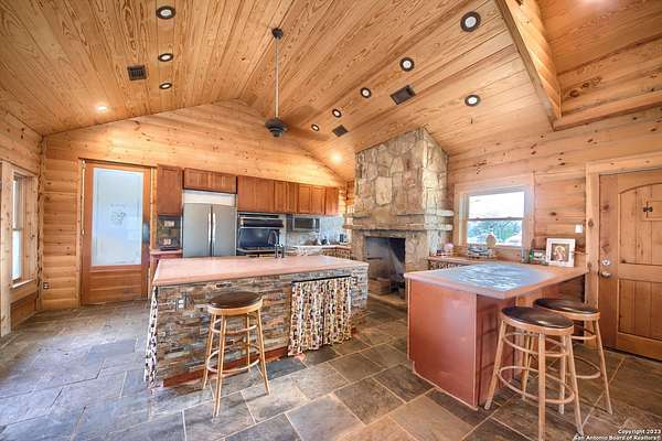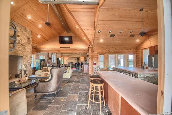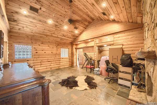 Only one owner, Home to former Ms. America International Diamond, Mrs. Texas US States, Ms. U.S. OF A., Ms. Asia America Ambassador. This beautiful custom Southland Log Cabin home has 3 custom stone work gas fire places (master br,kitchen & Livingroom). Fourth custom stone work (electric fireplace in 2nd bedroom). Raw slate flooring througout home. Walkin refrigerator & Freezer. Plenty of storage space in mud room (full shower). Available radio tower for onsite communication, Your very own onsite gas station (Reg. & Diesel gas tanks). Workshop 60X100 all four large oversized electronic garage doors & 2 reg. entry doors to mancave (also has full shower/restroom /business office and loft. Entry gate to property is antique & was once located in Paris, side interior doors are from a French Chateau in Paris. Several out building,Ranch hand quarters, 2 Metal storage bldgs,horse stahls ( some building do need some repairs). No mesquite trees or cedar trees. Plenty of mature oak trees throughout the 50.98 acres. Four additional slabs plumbed already and will hold four 2500 gallon water storage tanks. Owner grows fresh vegtibales & herbs in the keyhole garden located in exterior partial wrap around covered deck. Home is Nestled in a serene & peaceful location. Property has too much to mention. Enjoy the migration of hummingbirds & Abundance of wild life. We recommend you & your clients wear boots due to tall grass in some areas. Schedule your showing today.