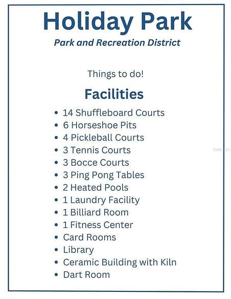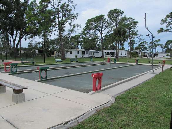 Community features 2 clubhouses, 2 heated swimming pools, library, fitness center, tennis courts, shuffleboard, pickle ball, bocce ball, horseshoe pits, ping pong, card room, billiards, ceramics & more. Water, sewer & electric hook ups in place. Maintenance fee is included in the annual property taxes. Close to restaurants, shopping, Warm Mineral Springs and the new Wellen Park.