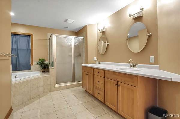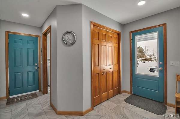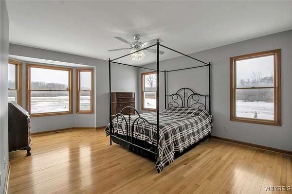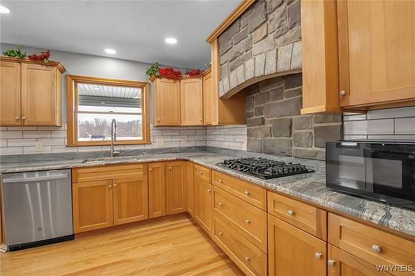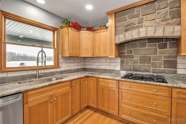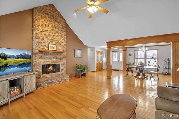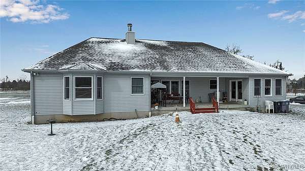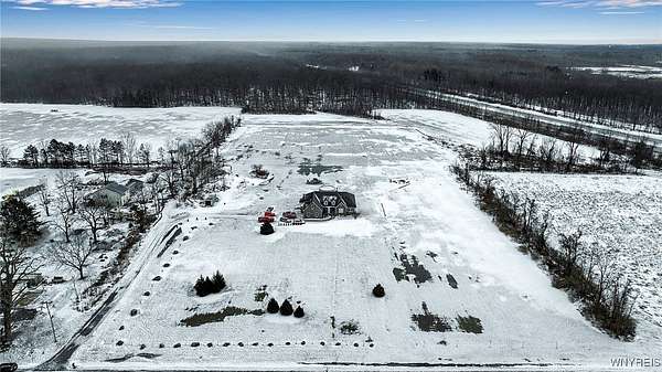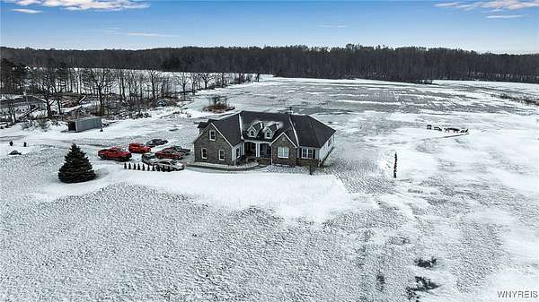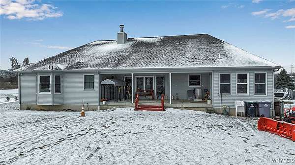 This 4 bedroom, 3 full bath sprawling ranch situated on 11.5 acres gives you over 2,800 sq ft of living space on first floor and an additional 384 ft finished above the garage - perfect for home office (current use)or 5th bedroom. Incredible gourmet kitchen with granite countertop, stainless steel appliances, stone hood, subway tile back-splash, and gas fireplace - with access to outside. Formal dining room extends to a beautiful living room with vaulted ceilings, wood burning fireplace, all leading out to covered concrete porch with magnificent view. Beautiful hardwood floors throughout. Master bedroom has a large master bath with jacuzzi tub and stand up shower. Two bathrooms have double sinks. Generous walk-in closet. 2 car garage with extra work space. Newer radiant floor heating system with 6 zones for comfort & efficiency. Newer on-demand tankless hot water. Central air. Large basement highlights top quality construction with 2 by 12 boards & steel i-beams. Permissive zoning is residential with commercial which allows for more uses. Town of Newstead records show sq. footage of the home is 2828 on the first floor. There is an additional 384 Ft finished room above garage. Moving made easy. A true must see.