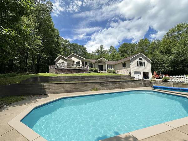Tucked away behind a serene canopy of trees, this sprawling 5 acre Germansville retreat borders state game lands. From the moment you glimpse the private pool nestled beneath a multi-tiered landscape to the warm light glowing behind dusk-lit windows, every detail hints at something extraordinary. The oversized great room with cathedral ceilings, a glowing double-sided fireplace, gives way to a sun-drenched kitchen lined with panoramic forest views. A tranquil primary suite whispers of quiet mornings, and the custom bath, complete with dual vanities and stone accents, feels like a spa wrapped in solitude. But it's the unexpected touches, a rustic deck perched above nature, a tucked-away sitting area, an inviting mix of textures, that truly compel you to explore deeper. Germansville, Pennsylvania is a peaceful enclave in Lehigh County, prized for its countryside charm and proximity to outdoor adventure. Just minutes from Leaser Lake Park and the Appalachian Trail, it's a haven for hiking, kayaking, and fishing enthusiasts. You'll also find yourself near award-winning wineries, farm-to-table restaurants, and the historic town of Slatington, rich with antique shops and small-town treasures. The area blends rural serenity with easy access to Route 309 and Route 100, making weekend getaways or quick trips to Allentown or Bethlehem a breeze. If you've been waiting for a home that delivers privacy, personality, and potential in one unforgettable package, this is it. Schedule your private showing today and discover why this captivating Germansville escape isn't just a place to live, it's a place to feel. Act quickly, properties with this much character and outdoor living space rarely linger for long.
