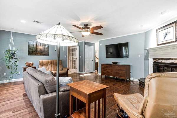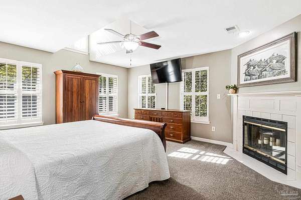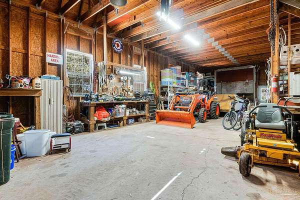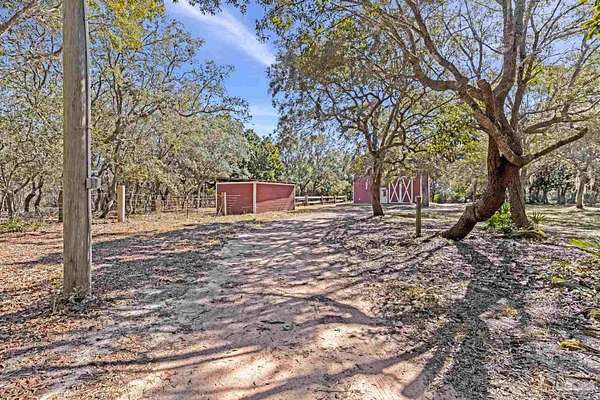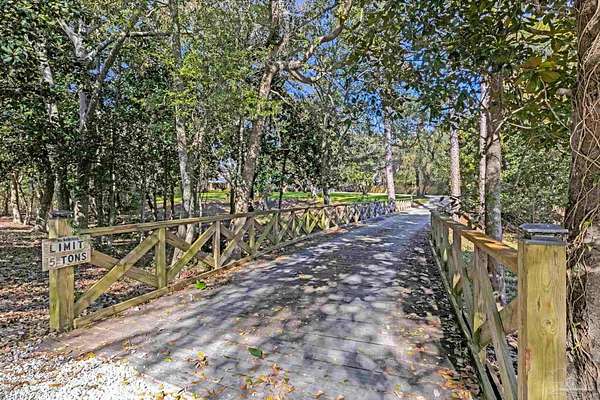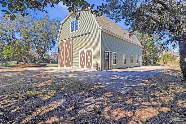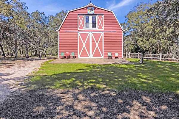 Welcome to your own private retreat right here in Gulf Breeze, and what a truly rare find it is. Properties like this almost never come available. This find offers over 11 beautiful, high-and-dry acres with mature trees, open pastures, and peaceful pockets of nature. You'll feel a world away, while still being just minutes from town and beaches. This is the kind of property where life slows down, and memories are made. Picture mornings sitting on the porch sipping coffee while watching the sun rise over the sound and evenings relaxing by the pond as the sun sets, watching herons and ducks float by. Wide open spaces for all the animals and hobbies you have dreamed of, with a fenced paddock and pasture for horses, goats, and more. This land is usable and thoughtfully laid out with two barns, one of which features an accessory unit ideal for a guest or private studio apartment. The large lap pool offers a perfect spot to cool off on warm Florida days. As you drive across your private wooden bridge over a meandering creek, there is an immediate sense of calm that sets the tone for the entire property. The custom-built brick home feels straight out of a storybook, welcoming you with an expansive front porch and a warm, inviting foyer. Inside, you find a formal dining room, a dedicated office, and a living room with dark hardwood floors and a fireplace. It is the perfect place to unwind at the end of the day. The kitchen features abundant wood cabinetry, black appliances, an island, and a breakfast nook. From there, there is easy access to the laundry room and an oversized side-entry two-car garage. Upstairs, the spacious primary suite offers its own fireplace, while the primary bathroom features double vanities, a tiled walk-in shower, dual closets, and an oversized soaking tub looking out to your private sanctum. There are two additional spacious bedrooms that share a full bath. Plus, a separate guest suite with a private entrance includes a mini kitchen and bath.
