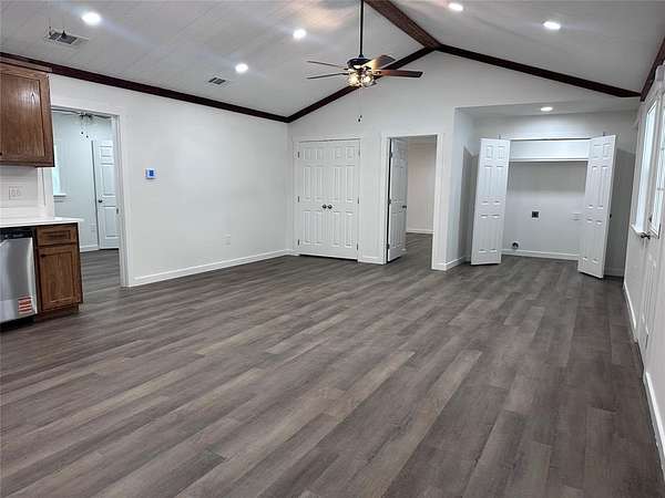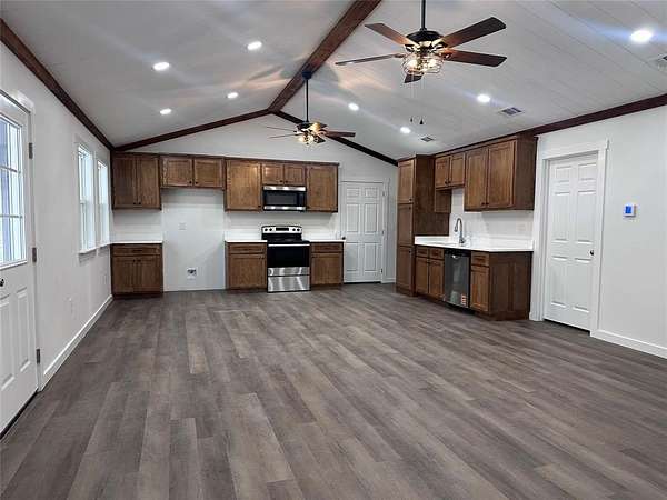 Enjoy the perfect blend of country charm and modern comfort with this 1,750 sf, 3 bedroom, 2 bath barndominium on 5.59 wooded acres. The open-concept floor plan features vaulted ceilings, rich wood cabinetry, stainless steel appliances, and durable vinyl plank flooring throughout. A large gravel driveway and parking area provide plenty of space for vehicles, trailers, or guests. The attached garage with roll-up door offers flexible use with an upstairs attic area providing ample room for storage or potential future expansion. With no restrictions, you can truly make this property your own by adding additional homes, a mobile home, or a tiny house. Bring your ideas and make this versatile property your own!