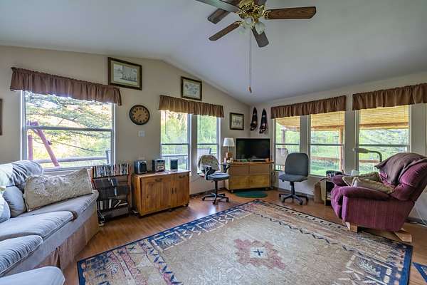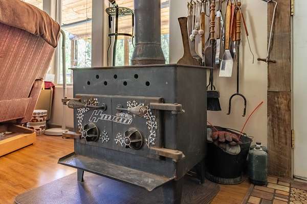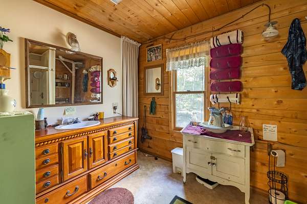 The 1,120 square foot cabin features two bedrooms and two bathrooms, powered by solar with a private well. The open concept living area with vaulted ceilings and large windows bring in natural light and showcase the surrounding forest. The kitchen includes plenty of counter space, room for dining, and flows into the cozy living room centered around a wood stove. A wraparound covered deck offers the perfect place to watch wildlife or keep an eye on family fishing in the nearby ponds. Heat is provided by wood or propane. The property also includes a 10×20 storage shed, and a well-built outdoor cooking area with its own large rock counter, ideal for campfire meals and family gatherings.