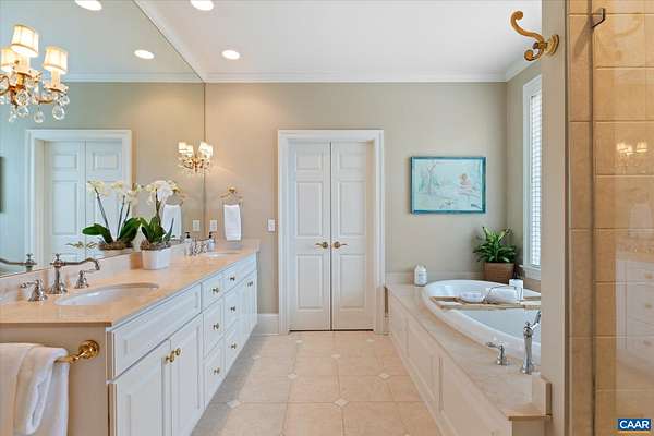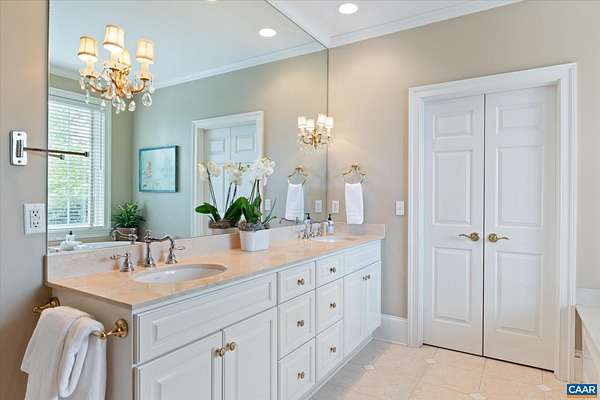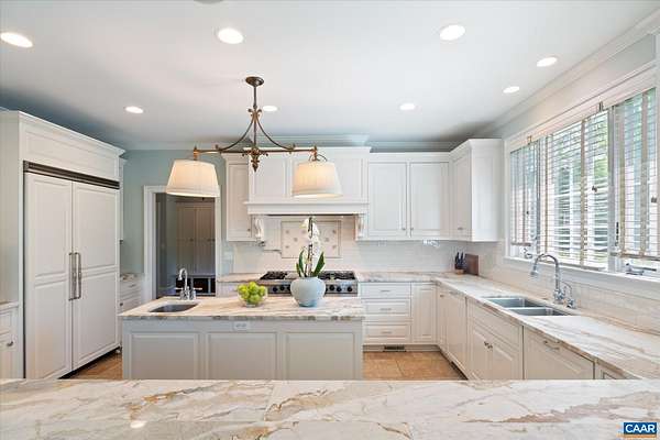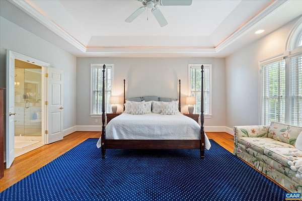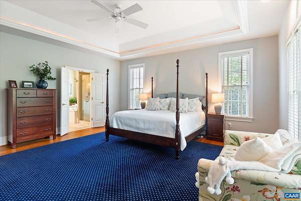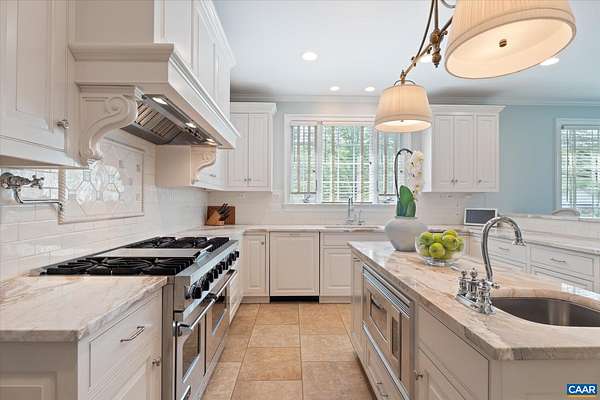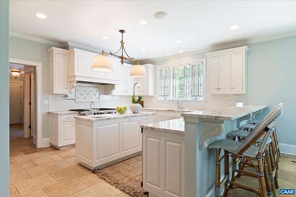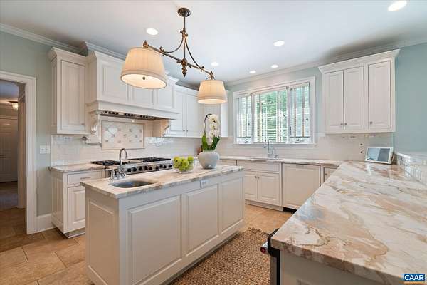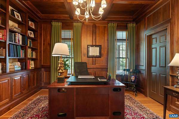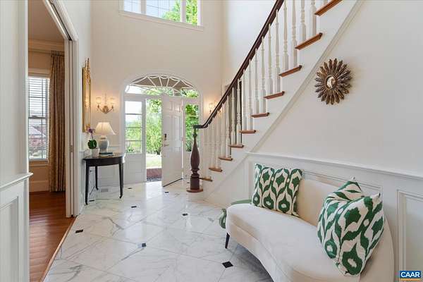 A stately residence in a coveted Ivy location features an exceptional floor plan that includes a first-floor primary suite and allows for seamless connectivity throughout thoughtfully designed rooms. The well-appointed kitchen is tailored for both everyday living and entertaining, featuring high-end appliances, a gas range, two dishwashers, a wet bar, a breakfast bar, and a sunlit breakfast room. Formal living and dining rooms offer timeless entertaining spaces, while a handsome study creates an ideal work-from-home setting. The inviting family room, anchored by a fireplace, opens to a delightful screened porch, perfect for relaxing or gathering. Upstairs, three generously sized bedrooms each feature ensuite bathrooms, while a fifth bedroom offers flexibility as a nursery or second office. A spacious recreation room above the three-car garage adds versatility. A massive unfinished basement with roughed-in bedroom, bathroom, and fireplace allows room for expansion. This home has it all, from a welcoming marble foyer with curved staircase to two laundry rooms and a mudroom. Enjoy Blue Ridge views from the front yard in this supremely convenient, pedestrian-friendly neighborhood known for its elegant homes and picturesque setting.