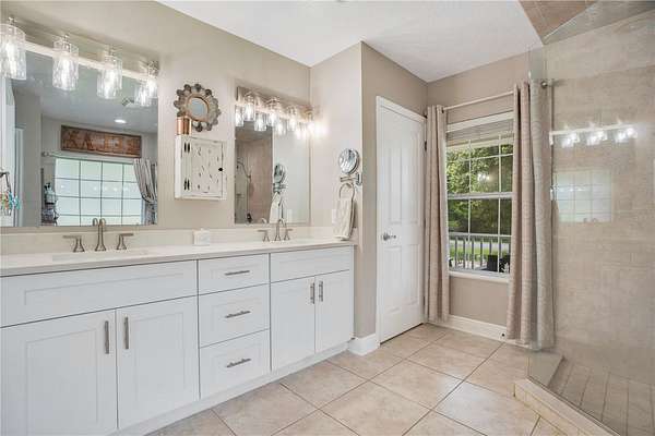 The main home showcases solid oak finishes, vaulted ceilings, and a stone propane fireplace with remote control, creating a warm and inviting atmosphere. The gourmet kitchen offers a large island, breakfast nook with a bay window overlooking the pool (with attached salt system), and easy flow into the dining room. The downstairs primary suite features dual vanities, a jetted hydro-massage tub, custom walk-in shower, and oversized closet. Upstairs, you'll find three spacious bedrooms, a full bath, a media room or versatile bonus/game room.