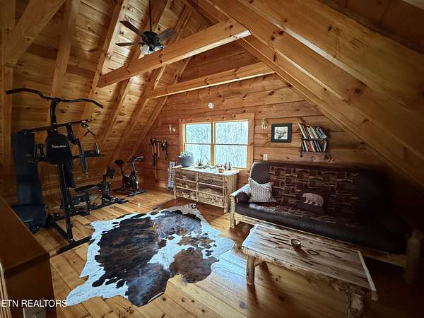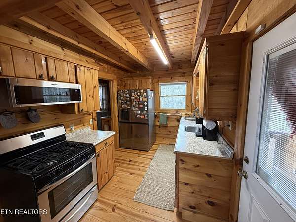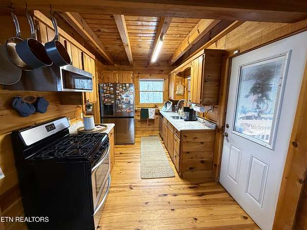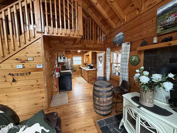 The main cabin features 994 square feet of finished living space along with an additional 724 square feet of unfinished basement that is ready for future expansion. The interior includes one bedroom, one full bath, a large sleeping loft, hardwood floors throughout the main living areas, and a tiled walk-in shower in the full bath, which also includes a stackable washer and dryer. The living room is warmed by a wood-burning stove, and the kitchen is fully equipped with a large refrigerator, dishwasher, gas range, and microwave. Home has central heat and air using a heat pump for year-round comfort