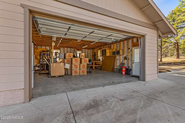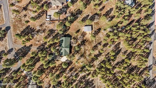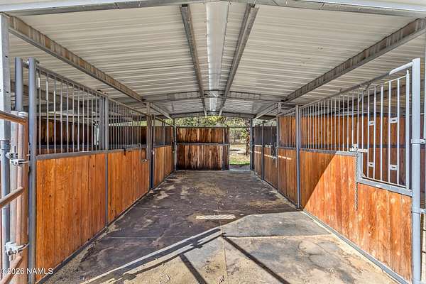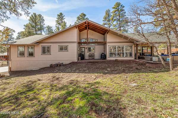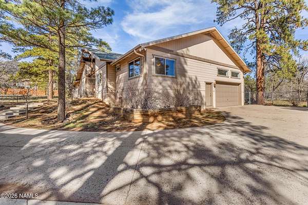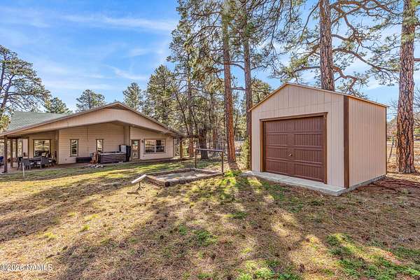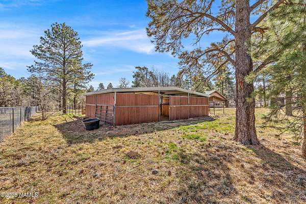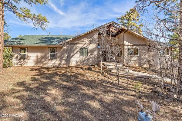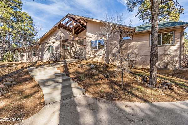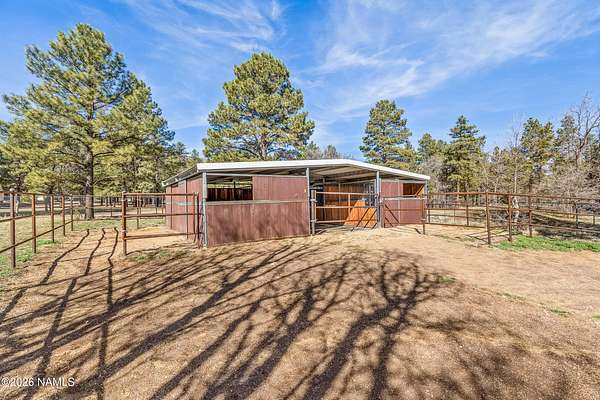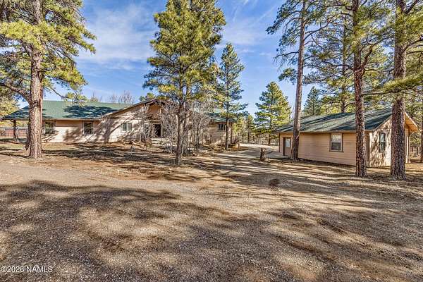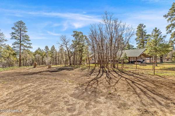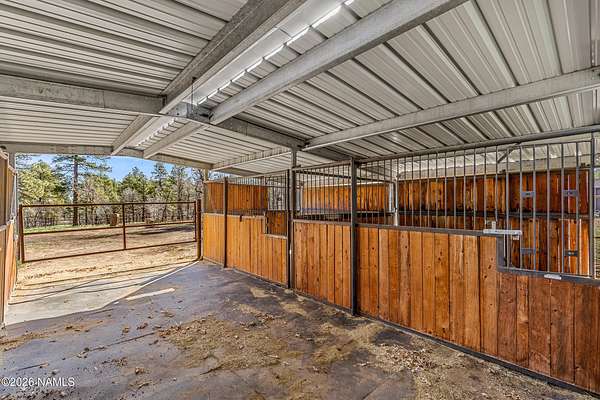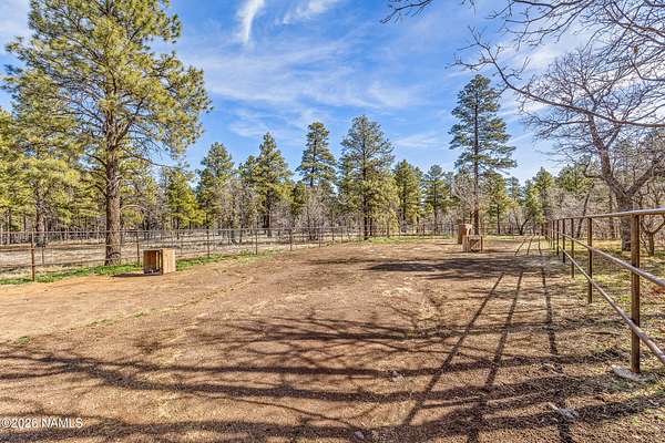 This rare 2.5-acre horse property in the tall pines of Flagstaff offers the perfect combination of forest privacy and equestrian convenience. The property has NO HOA and is fully equipped for horses with a four-stall barn, multiple turnout areas, steel pipe fencing, and a custom tack room and wash area. Surrounded by mature ponderosa pines, the setting feels peaceful and secluded while still being close to town and nearby trail systems, including access to Picture Canyon that you can ride out to. The single-level home features wood-look tile flooring throughout, in-floor heating, a gas stove, and a bright, open living area. The kitchen includes newer appliances and subway tile backsplash, while the home also offers a remodeled powder room and and a separate laundry room with cabinetry and a utility sink. Outdoor living shines with a large, covered patio, seating area, fire feature, and hot tub overlooking the property. Attached 2-car garage plus an additional detached 2-car garage/workshop provide ample space for vehicles, trailers, tack, or recreational gear--making this a true Northern Arizona horse property ready for riding and enjoying the outdoors.
