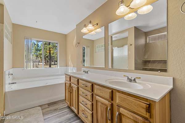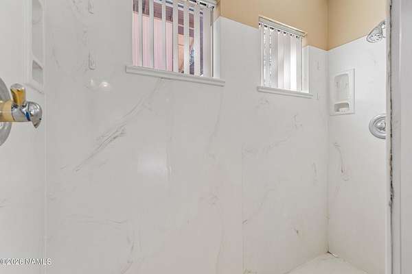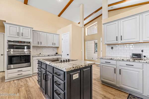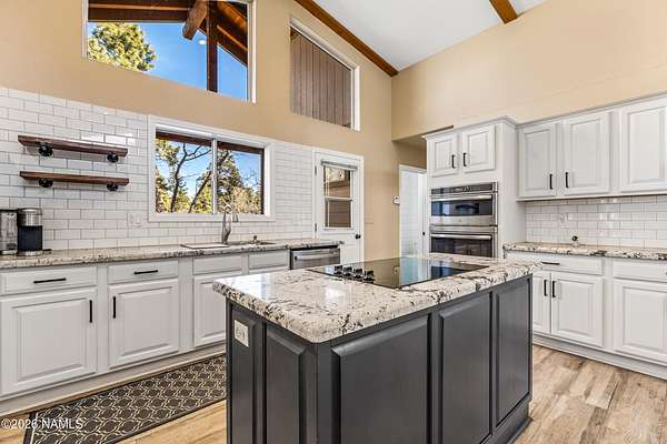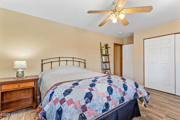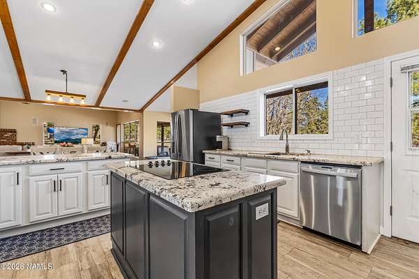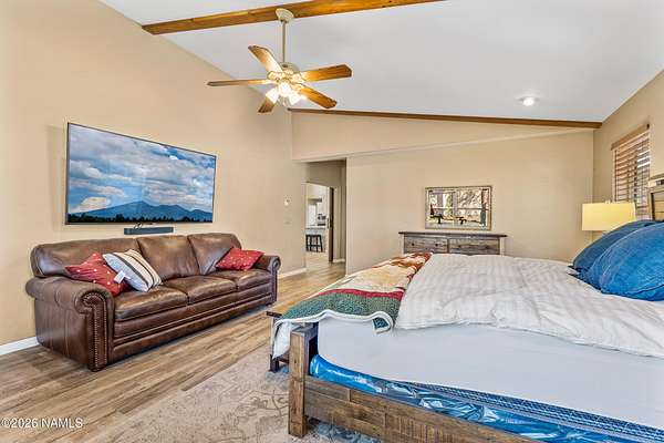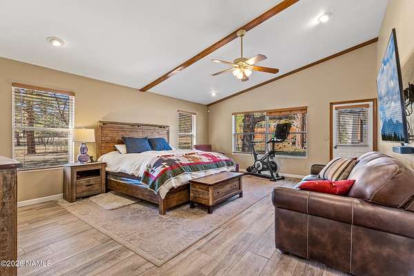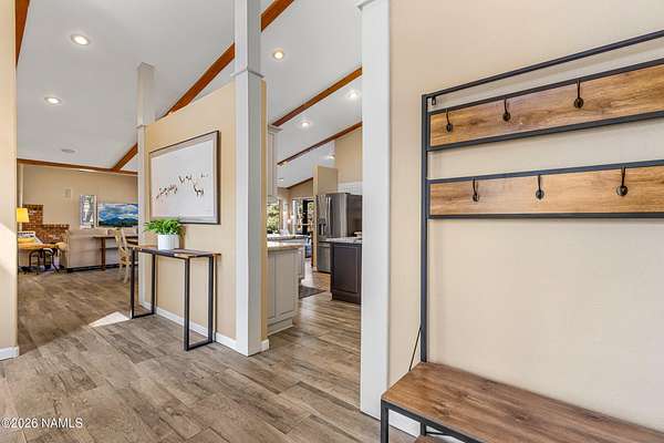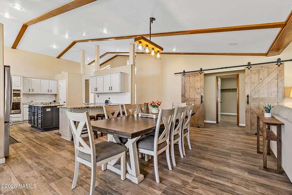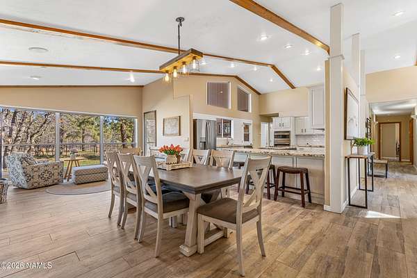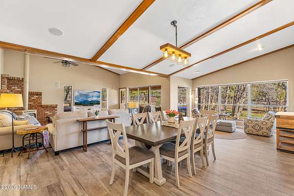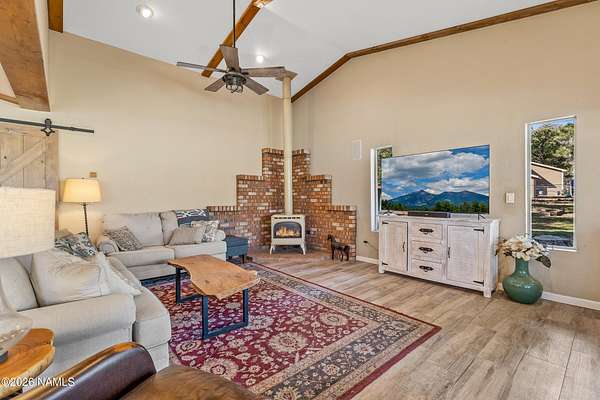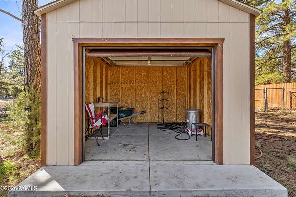 This rare 2.5-acre horse property in the tall pines of Flagstaff offers the perfect combination of forest privacy and equestrian convenience. The property has NO HOA and is fully equipped for horses with a four-stall barn, multiple turnout areas, steel pipe fencing, and a custom tack room and wash area. Surrounded by mature ponderosa pines, the setting feels peaceful and secluded while still being close to town and nearby trail systems, including access to Picture Canyon that you can ride out to. The single-level home features wood-look tile flooring throughout, in-floor heating, a gas stove, and a bright, open living area. The kitchen includes newer appliances and subway tile backsplash, while the home also offers a remodeled powder room and and a separate laundry room with cabinetry and a utility sink. Outdoor living shines with a large, covered patio, seating area, fire feature, and hot tub overlooking the property. Attached 2-car garage plus an additional detached 2-car garage/workshop provide ample space for vehicles, trailers, tack, or recreational gear--making this a true Northern Arizona horse property ready for riding and enjoying the outdoors.