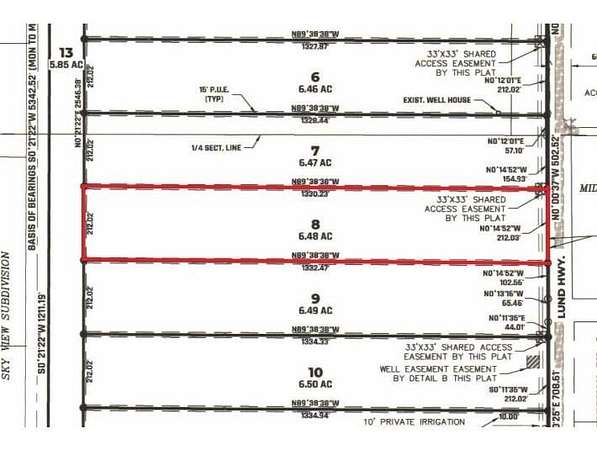 This spacious 6.48 acre lot in the Peak View Ranchettes subdivision offers an impressive amount of land, measuring 212.02 feet wide and 1330.23 feet deep. The property is easily accessible via a county-maintained paved road. You have the flexibility to bring your own builder. Utilities with Rocky Mountain power, already stubbed to the lot. Each lot comes equipped with a culinary water connection through the Water Conservancy District and includes one share in the Peak View Ranchettes Irrigation Company. Notably, the sellers have installed secondary irrigation systems, making it easy to provide water for pastures and gardens. The lot extends beyond the existing fence line, offering additional space beyond the enclosed area, enhancing the overall appeal of this remarkable property.