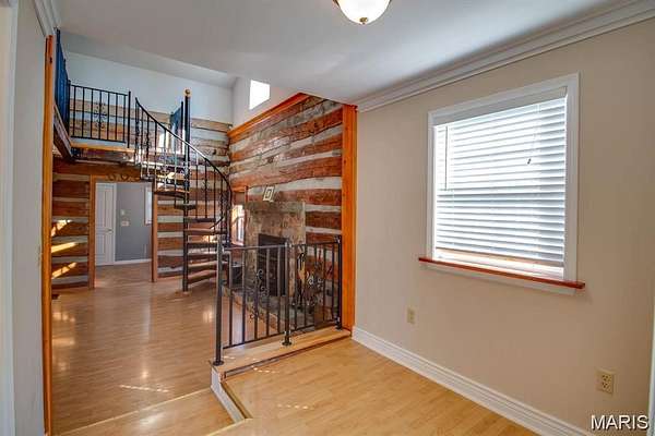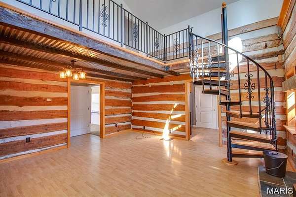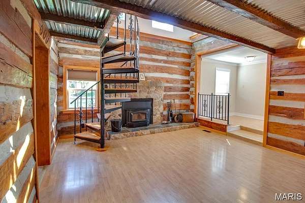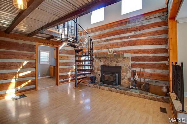 The kitchen features tasteful wooden cabinets and stainless steel appliances. New roof installed summer of 2025 adds peace of mind. A handcrafted spiral staircase leads to the loft-style second bedroom and bathroom, adding character and architectural interest. The living room showcases original exposed logs from the home’s early days as a one-room cabin, paired beautifully with a newer wood-burning fireplace that enhances the cozy, lodge-inspired feel. An unfinished walkout basement offers excellent potential for future expansion, additional rec space, or personalized customization. A detached outbuilding—offers a chicken coop and additional outdoor storage.