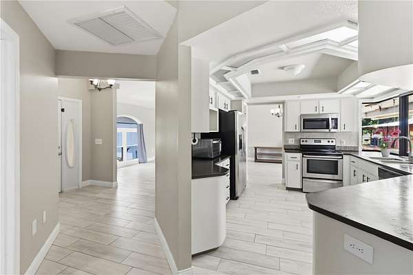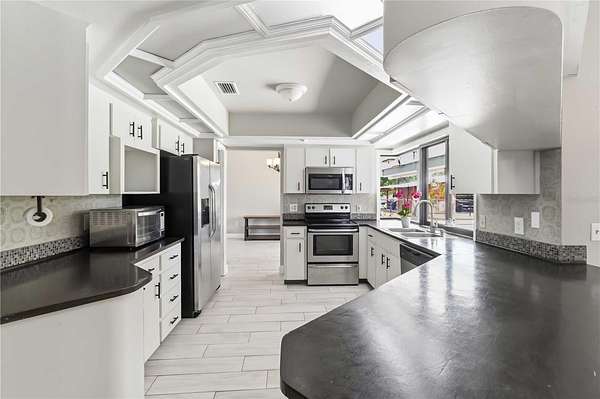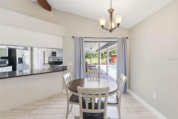 The kitchen is thoughtfully designed with stainless steel appliances and a unique pass-through window that opens directly to the back patio; perfect for seamless indoor-outdoor entertaining, especially when paired with the covered outdoor bar area, creating an ideal setup for hosting gatherings with ease.