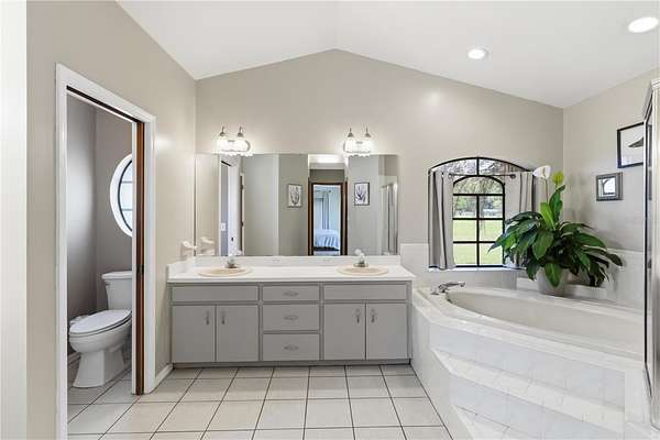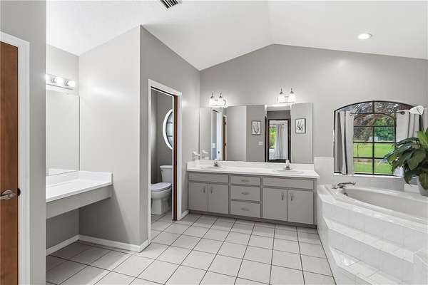 The spacious primary suite serves as a true retreat, featuring dual walk-in closets and an expansive en suite bathroom complete with a soaking tub, separate shower, dual vanities, and a dedicated vanity area. A desirable split-bedroom layout places the two additional bedrooms on the opposite side of the home, where they share a well-appointed hall bath.