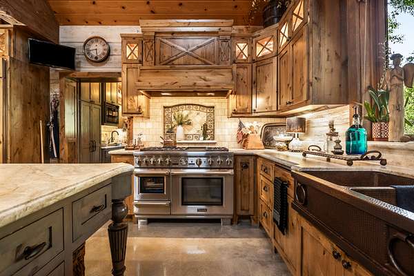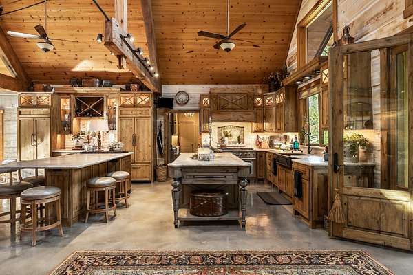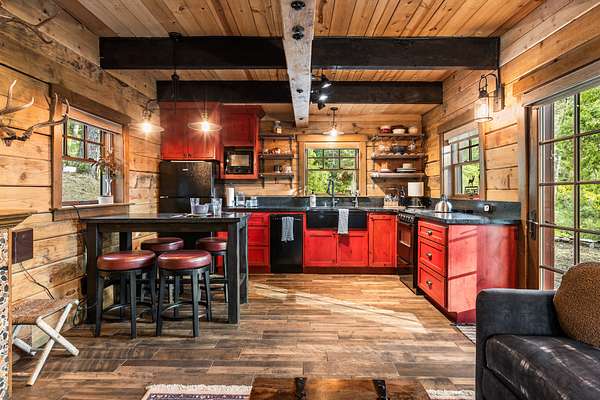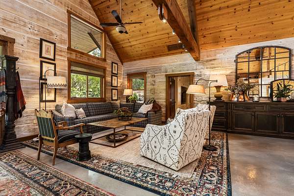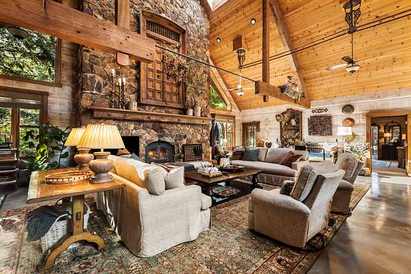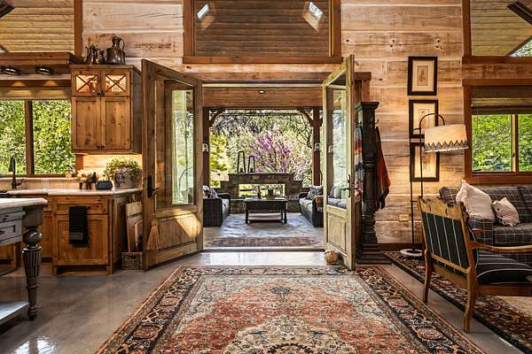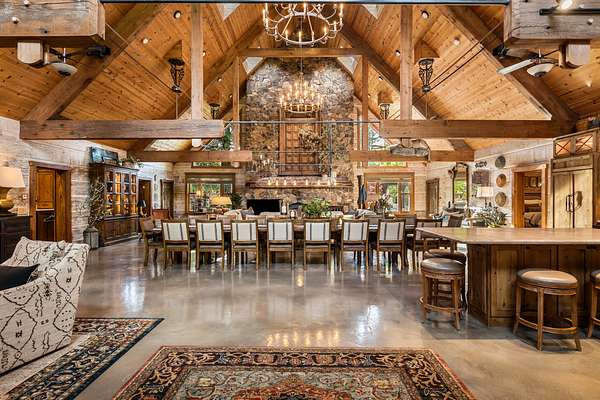 At the heart of the ranch stands a striking 3,720 SF custom lodge-style timber home, where rustic craftsmanship meets refined living. This is not just a house, it's a masterpiece. Towering, storied timbers salvaged from the historic late-1800s Elko, Nevada Pacific Railroad Station, infuse the home with soul and timeless character. Inside, the design balances grandeur with warmth, creating a space that is as breathtaking as it is welcoming. The lodge features three thoughtfully curated bedrooms, two beautifully appointed bathrooms, and a showstopping chef 's kitchen -- a culinary haven designed for those who cook with passion and entertain with ease. Rising 30 feet high, the hand-stacked rock fireplace is a breathtaking centerpiece, crafted from stones gathered on-site, evoking the grandeur of a mountain lodge and anchoring the home in history, heritage, and heart. Multiple living and dining areas provide ample room for gathering, while outdoor patios with fireplaces invite you to relax and savor the sweeping vistas of the surrounding river valley.