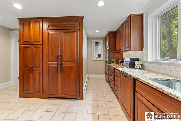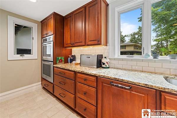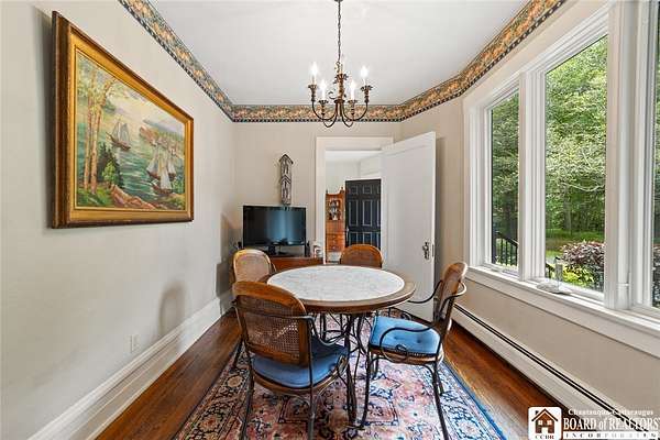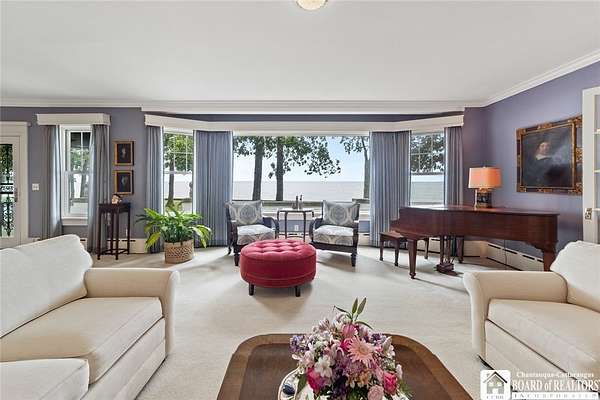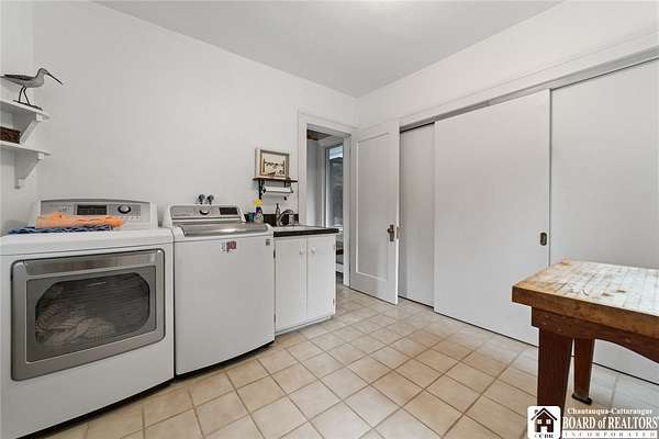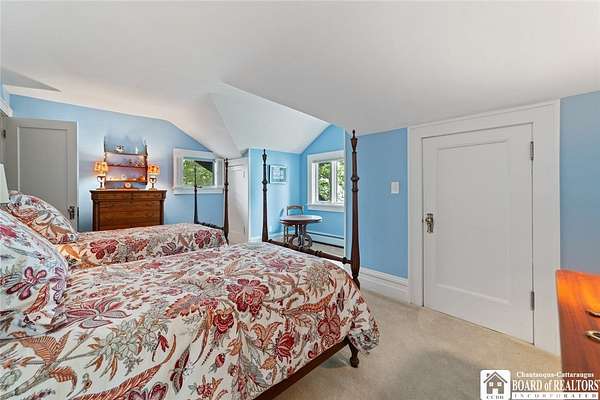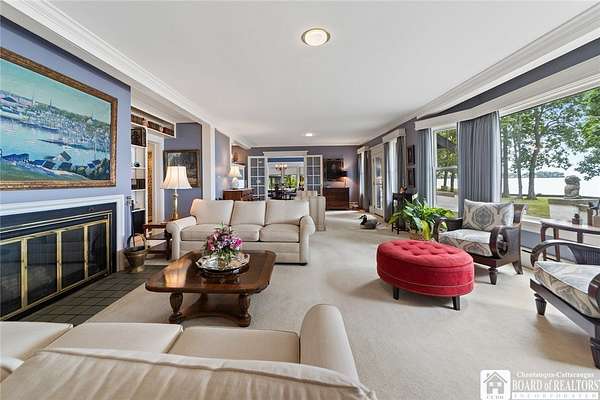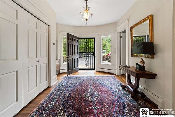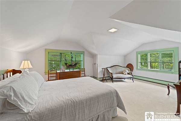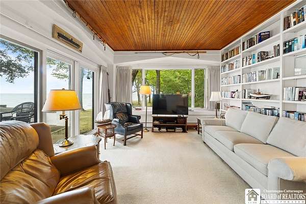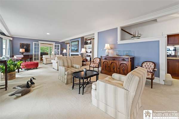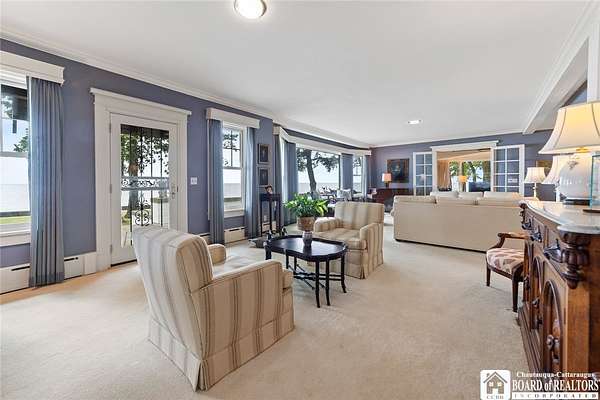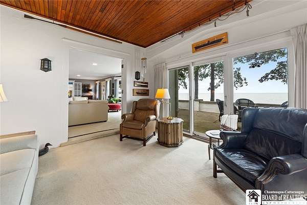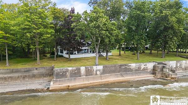 Town of Dunkirk Lakefront! Classic charm meets lakeside luxury in this stately 4-5 BR/2.5 Bath home with 193' of lake frontage set on a 4.8-acre wooded parcel with a winding driveway approach! Built in the early 1900s and lovingly maintained by three generations, this residence blends historic character with modern updates. Convenient first-floor primary suite with breathtaking lake views! The modern cherry kitchen includes a cozy dinette, while the spacious first-floor laundry/mudroom connects to the attached 2-car garage. Elegant formal dining room, living room, and den feature French doors, built-ins, fireplace, and panoramic lake vistas. The grand foyer highlights entry closets and a half bath. Upstairs offers 3-4 bedrooms, a full bath, plus a walk-in attic. Bonus features: an additional 2-car detached garage and a whole-house generator.