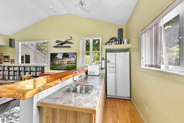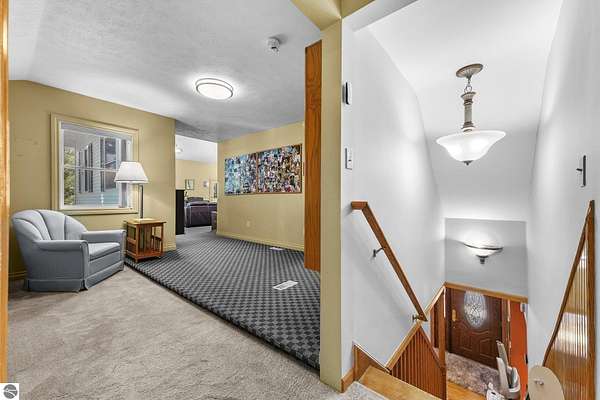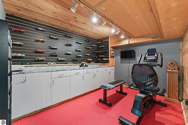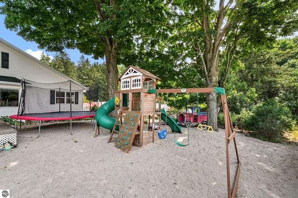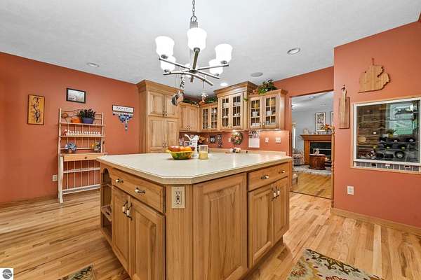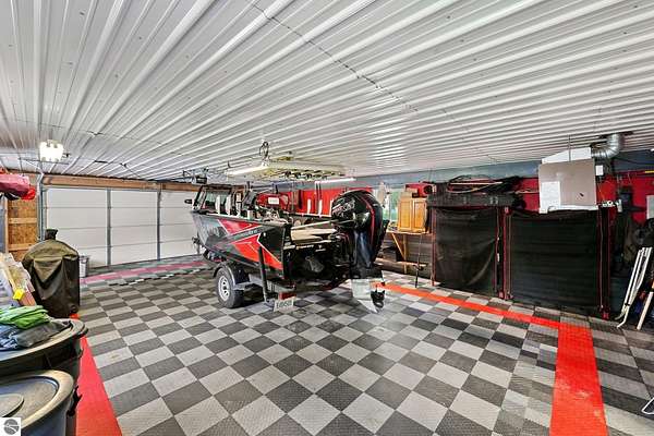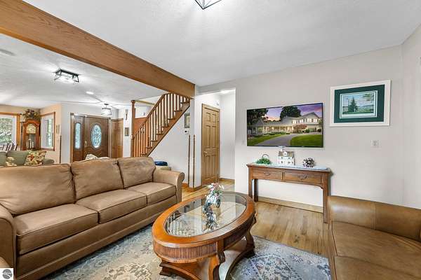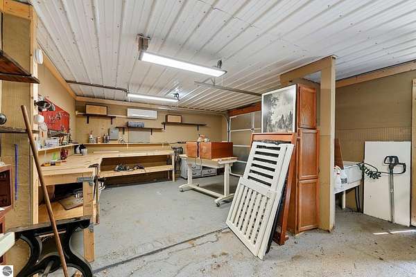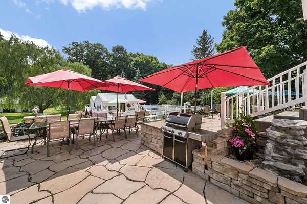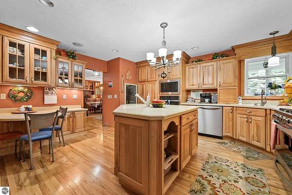 Welcome home! This is how you will feel as you enter this incredible two-story home. Designed for entertaining or lots of room to play, this home has something for everyone. Inviting foyer opens to spacious main flooring living room with gas f/p and dining area. Gracious island kitchen with hardwood flooring, stainless appliances and solid surface counter tops. Main floor primary suite with private bath, jacuzzi tub and tiled walk in shower. Upper level features fully loaded family room with kitchenette, and room for all your guests. Full finished walkout lower level with sauna. Exceptional grounds include wrap around covered porch, in-ground heated pool, pool house, changing rooms, & playground area. There is truly something for everyone here, adult "playground" can be found in the 24 foot x 118 foot heated, insulated finished pole building, with 4 designated areas, last stall features raised ceiling. Secondary 16 x 36 barn with heat/ac and water. In addition to 5 plus acres, home comes with shared Silver Lake access. Well maintained home ideally situated a short drive to Traverse City.Majority of home was built in 1998 small portion original to 1948.