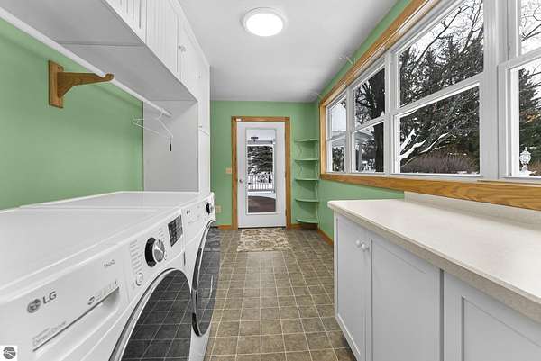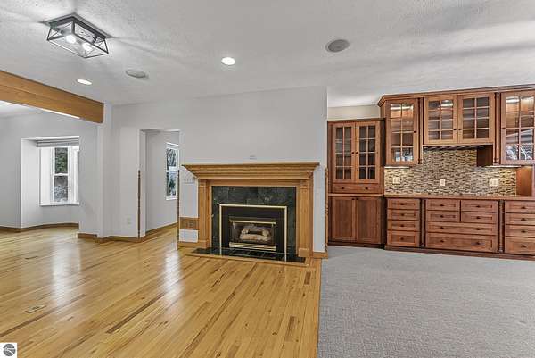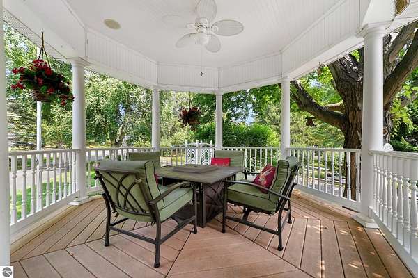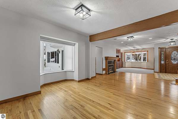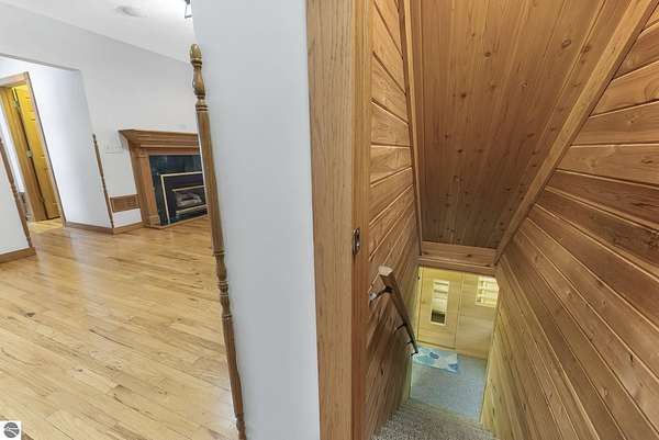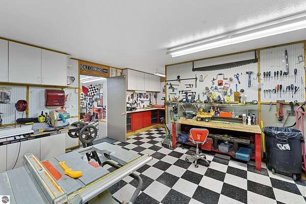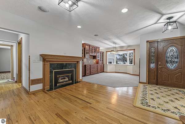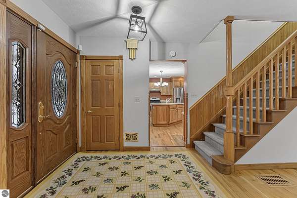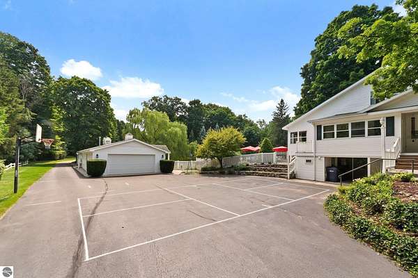 Welcome home! This is how you will feel as you enter this incredible two-story home. Designed for entertaining or lots of room to play, this home has something for everyone. Inviting foyer opens to spacious main flooring living room with gas f/p and dining area. Gracious island kitchen with hardwood flooring, stainless appliances and solid surface counter tops. Main floor primary suite with private bath, jacuzzi tub and tiled walk in shower. Upper level features fully loaded family room with kitchenette, and room for all your guests. Full finished walkout lower level with sauna. Exceptional grounds include wrap around covered porch, in-ground heated pool, pool house, changing rooms, & playground area. There is truly something for everyone here, adult "playground" can be found in the 24 foot x 118 foot heated, insulated finished pole building, with 4 designated areas, last stall features raised ceiling. Secondary 16 x 36 barn with heat/ac and water. In addition to 5 plus acres, home comes with shared Silver Lake access. Well maintained home ideally situated a short drive to Traverse City.Majority of home was built in 1998 small portion original to 1948.