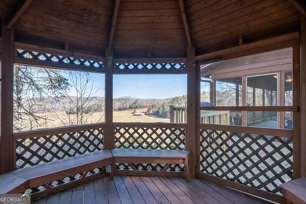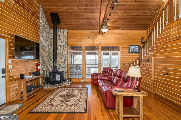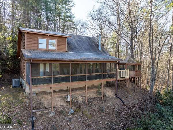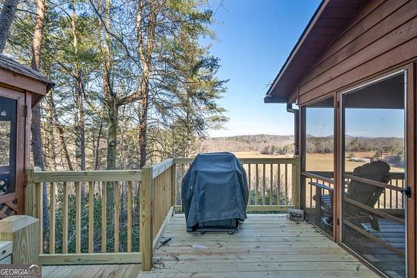 River Frontage! Mountain Views! Acreage! This rustic cabin will check all the boxes on your mountain home wishlist. Be wowed with 316 feet of Toccoa River frontage plus picturesque 180 degree long range mountain and pasture views. Take the long, gated driveway to this very private location that is only 5 minutes to Downtown Blue Ridge. This 3 bedroom with loft, 2.5 bath cabin on over 3 acres has only had 2 owners! Featuring an open floor plan with vaulted ceilings, rustic wood finishes, and charm and character throughout, including 100+ year old stained glass windows repurposed from the original owner's family's church. The open kitchen has granite countertops and stainless steel appliances, along with dining space with a built-in window seat. French doors lead out to a screened-in porch spanning the back of the home for the perfect spot to indulge in the mountain, river, and pasture views. Two spacious bedrooms, one with attached half bath, along with a full bath, and laundry space finish the first floor. Up the stairs is a large bedroom with vaulted ceilings, en-suite bath, and windows to enjoy the views. There is also a loft space perfect for additional sleeping space, office, or however you wish to use it. Enjoy the outdoors with the screened porch that leads to an open deck ideal for grilling, along with a giant gazebo, where you can enjoying a drink while you breathe in the mountain air and enjoy the sounds of the river. Cabin comes furnished to use for your personal mountain oasis or keep as a vacation rental. Make this riverfront, mountain view, rustic home yours today! Very minimal restrictions.
