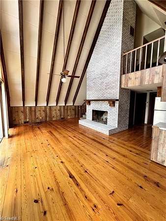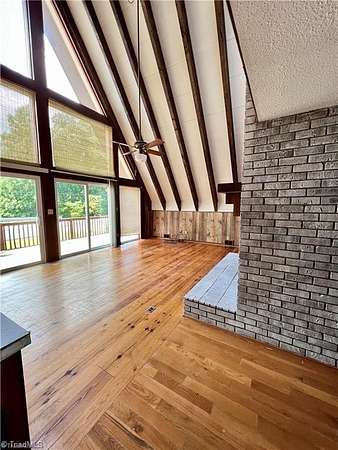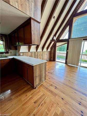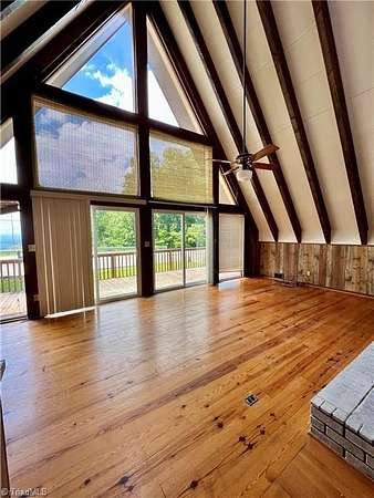 Est $1,647/moBRAND NEW ROOF! This beautiful A frame style home on Brushy Mtn Road sits on 1.5 acres per tax card & has an outstanding view of Wilkesboro! All sliding glass doors were replaced & a new hot water heater installed in 2022. Sits on a 0.43 acre portion of parcel ID 0400718. The additional acreage sits across the road and can be purchased.