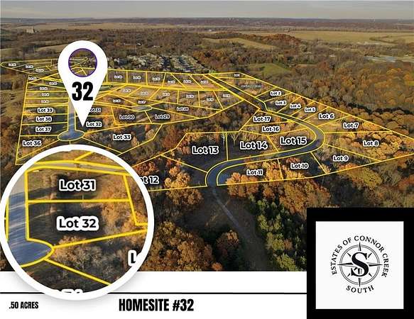 A STUNNING 1/2 ACRE, "BUILD READY" HOME SITE #32 ON A PRIVATE CUL-DE-SAC = Where Luxury Breathes & Dreams Break Ground! A place where the horizon stretches wider, the air feels lighter & the promise of your future home begins long before the foundation is poured. On the edge of Kansas City, a new community "set apart" featuring a rare collection of homesites that have been carved into the rolling landscape just beyond the Legends in Kansas City, KS! A mix of sprawling .5+ acre to 1+ acre estate lots that invite you to design a residence worthy of your dreams. Each homesite offers sweeping views, surrounded by mature trees, open skies, and the quiet rhythm of nature-all set along winding paved streets with curbs, gutters + city sewer! Where countryside serenity meets effortless access in the award-winning Piper School District. A premier location just 20 minutes from KCI International Airport, the historic charm of Weston, the riverfront elegance of Parkville, the vibrant culture of Lawrence & the stability of Fort Leavenworth. With the Legends premier shopping, elite dining, endless entertainment and sporting events and venues, Championship golf courses, natural sanctuary of WYCO Lake w/ chart-topping musical performances at an amphitheater. Finally, convenience is within reach-yet life feels wonderfully private. Existing Amenities help set the tone for elevated living w/o the wait. Those seeking guidance. Our ONSITE preferred custom builder stands READY to collaborate OR help you find the right builder & turn your dreams into reality! This is not simply a place to build a home, it is the beginning of your story! Take a scenic drive & preview this EXCLUSIVE collection of 56 beautiful homesites, each tucked into the reserved hills of this BRAND-NEW community, where your estate begins with a dream & rises into a life lived beautifully in the heart of Kansas City, KS.