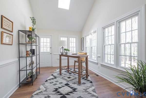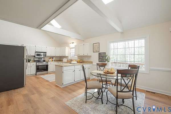 Escape to your private 2-Acre wooded retreat to experience the perfect blend of rustic charm and modern updates. Sip morning coffee from the swing on your idyllic full front porch and feel the world slow down. Inside, the home feels fresh and expansive, anchored by brand-new wood-style luxury vinyl plank flooring and fresh new paint that flows seamlessly throughout the entire home. The main level offers ultimate convenience with a spacious primary suite boasting a full en-suite bath and adjacent laundry. The heart of the house is the sun-soaked kitchen, featuring airy two-story vaulted ceilings, exposed beams, and skylights that flood the space with natural light. Upstairs, you'll find two additional generous bedrooms with ample closet space. Relax in the glowing sunroom with extra-large windows, or step out onto the rear deck to take in the sprawling, lush woodlands. This gem won't last! More professional photos to come Tuesday 2/24