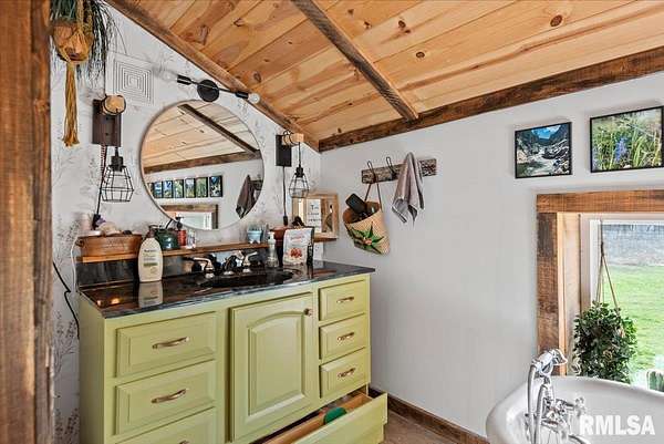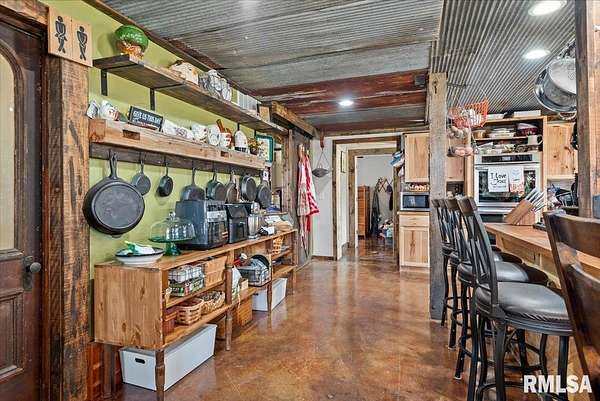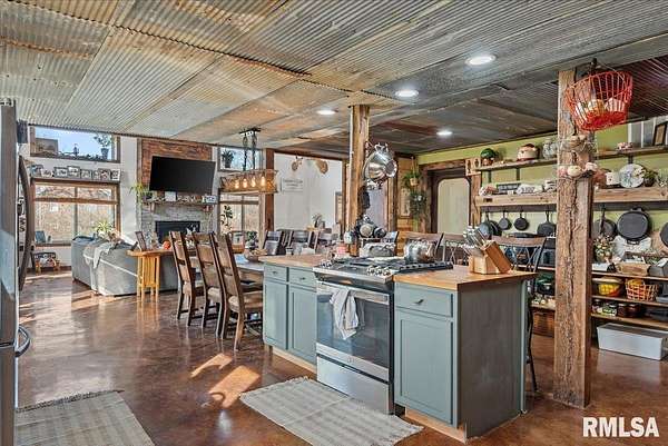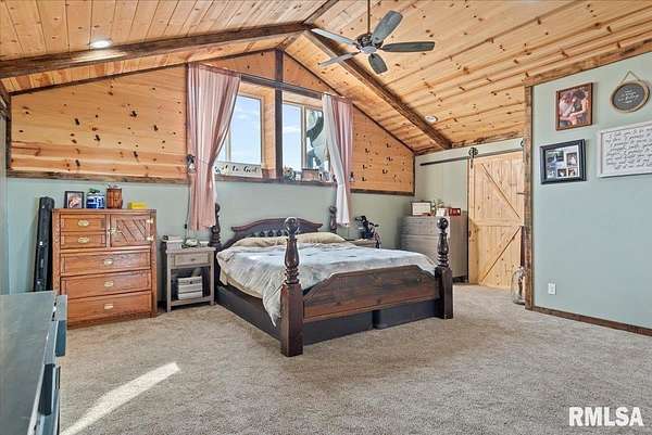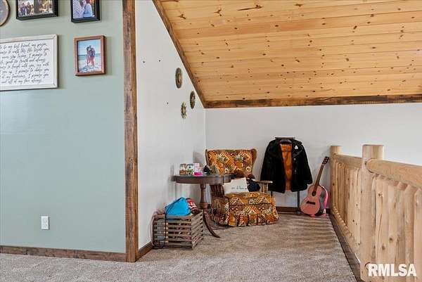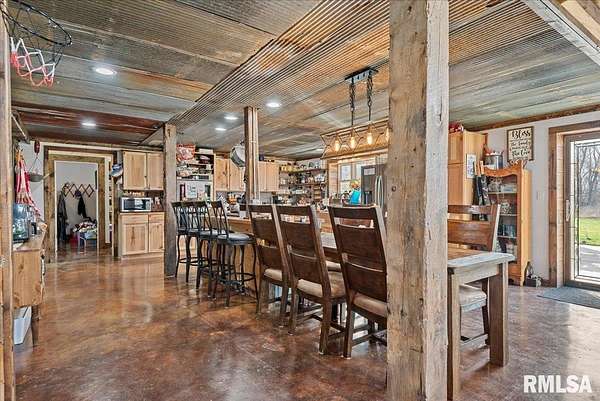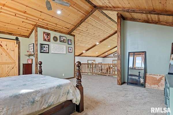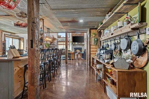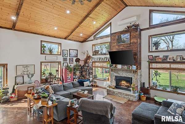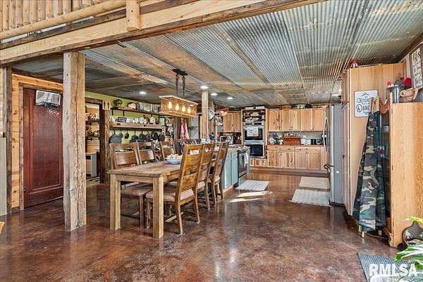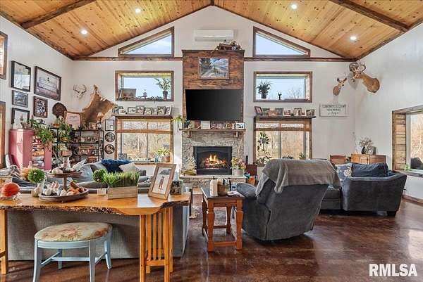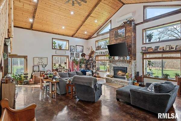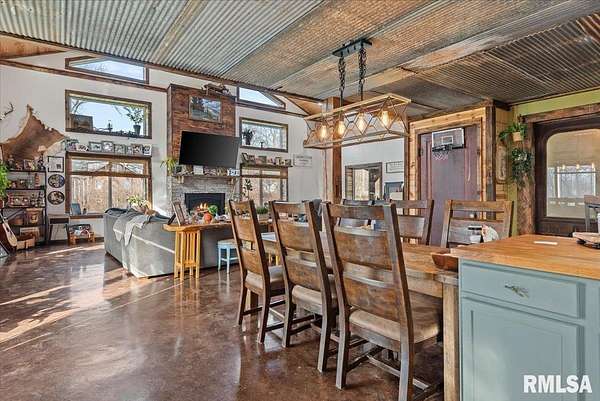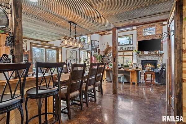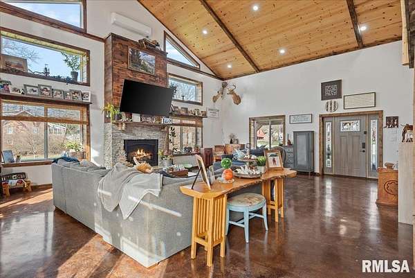 Built in 2022, this one-of-a-kind home blends modern efficiency with rustic charm and sits on 4.91 acres on the edge of town, offering privacy, space, and beautiful wooded views. The exterior features durable steel siding and a steel roof, along with a large covered front porch that welcomes you into the home. Inside, the spacious living room is the heart of the home, showcasing vaulted wood ceilings and a stunning center fireplace that creates a warm, inviting atmosphere. The primary suite overlooks the living room from the upper level, providing a unique open feel while still offering a private retreat with its own attached bathroom. Just off the living room is the rustic-style kitchen, featuring wood cabinetry, a metal ceiling, and a large center island. A full bathroom and convenient laundry/pantry room are located just off the kitchen. The main level includes two additional bedrooms, plus a second living space currently used as a canning/dining room, offering flexibility for your needs. Comfort is key with concrete flooring throughout the home with in-floor heated tubing, keeping the entire house cozy and warm. Step outside to enjoy the large backyard patio overlooking peaceful wooded views, perfect for relaxing or entertaining. The property also features an attached 900+ sq ft two-car garage and an additional two-car carport providing space for vehicles, equipment, or recreational toys. If you're looking for modern construction, rustic character, and acreage near town