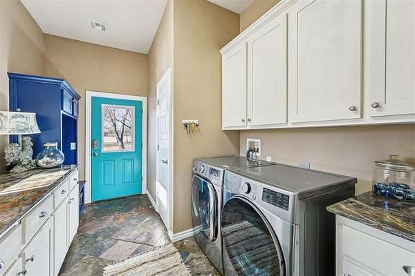 Designed as a private Oasis, 518 South Portland Avenue in Newcastle is a rare convergence of luxurious engineering, artistic expression & enduring craftsmanship, custom built in 2013 and surrounded by 10 acres of secluded Oklahoma landscape, just minutes from modern conveniences. Accessed by a private road shared by only four residences, this ICF-constructed Barndominium offers exceptional structural integrity, energy efficiency, and quiet comfort. Every aspect of the build reflects intentional engineering choices designed for longevity, performance, and daily ease. Inside, three bedrooms and 3 Bathrooms and a half bath balance openness with retreat. A spacious living room flows into a large dining area, ideal for everyday living and entertaining. A laundry area and side entry with a beautifully painted mud area add functional elegance. The kitchen features granite countertops, two oversized islands with cabinetry, a built-in gas cooktop, double ovens, and slate floors, creating a space that is both artistic and livable. The primary suite is privately positioned, showcasing painted artistic wood detailing, a whirlpool soaking tub, and an elegantly tiled shower. On the opposite side, two additional bedrooms are separated by a private hallway, with a secondary bathroom and custom-shelved closet between them. A central vacuum system is seamlessly integrated. Deer and wildlife are frequent visitors, reinforcing the property's sense of privacy and connection to the land without sacrificing modern comfort. Exterior features include metal siding and roof, covered front and back porches with exposed wood beams, an attached two-car garage, a one-acre pond, wooded acreage with a dam, open land, a 30' x 50' shop with concrete flooring, and an above-ground pool. Served by public water and natural gas. Tucked discreetly behind an existing development, the property unfolds into a world apart-your new Oasis. Paradise isn't promised here. It's already present.
