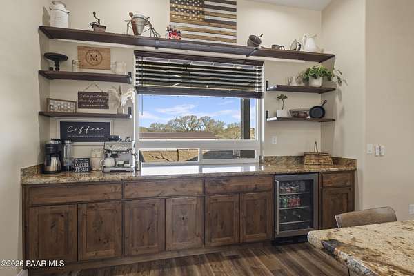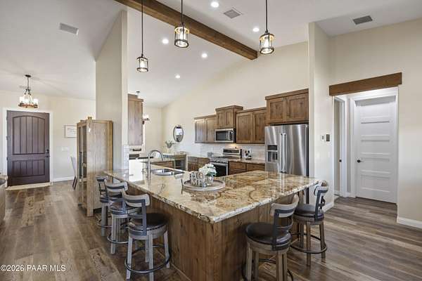 - Bar, Beamed Ceilings, Ceiling Fan(s), Counters-Solid SRFC, Granite Counters, High Ceilings, Hot Tub/Spa, Kitchen Island, Live On One Level, Master Downstairs, Walk-In Closet(s), Wash/Dry Connection, Wet Bar, Wired For Sound