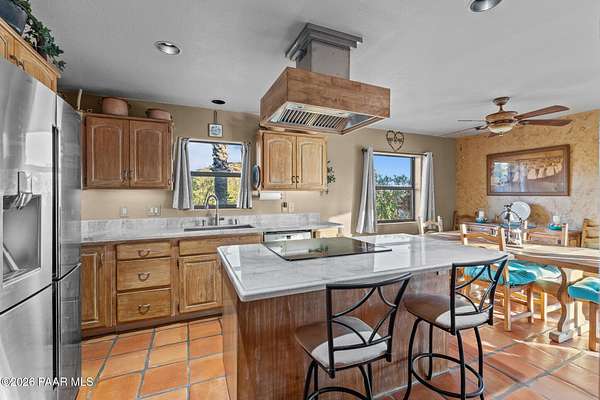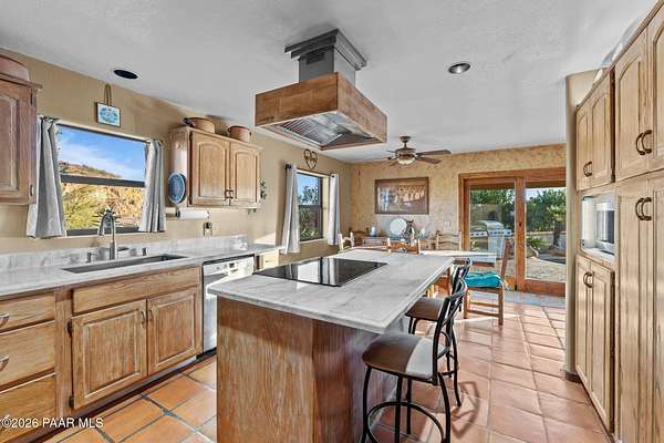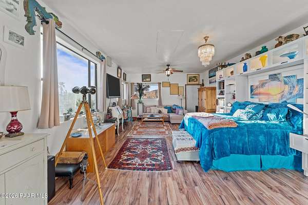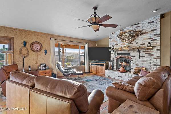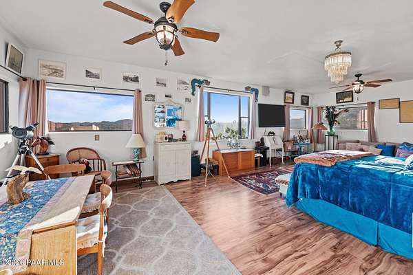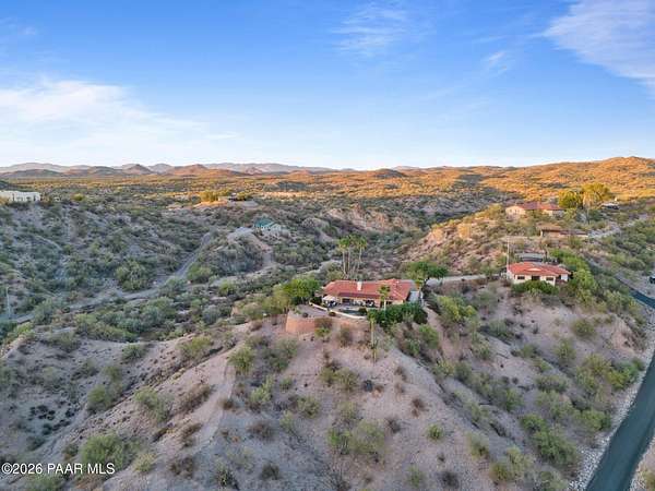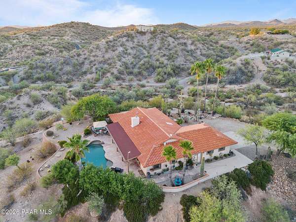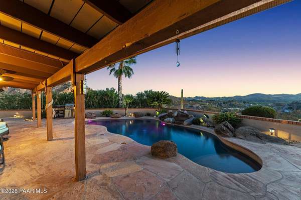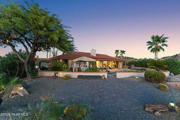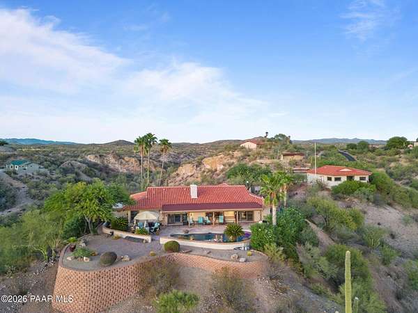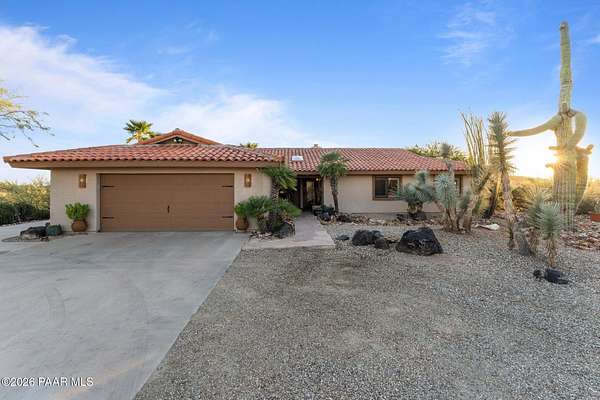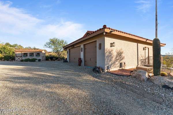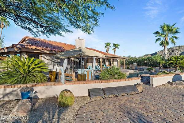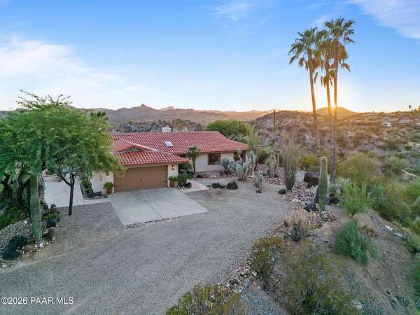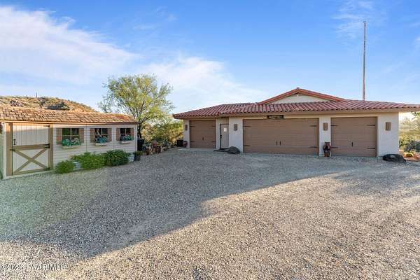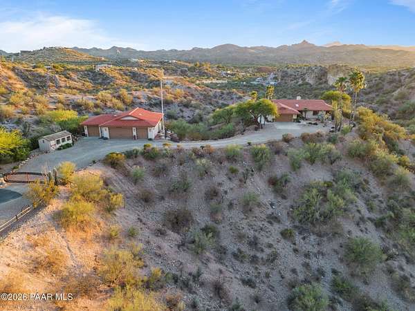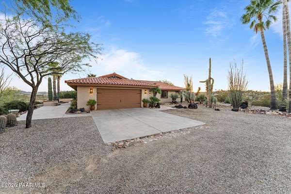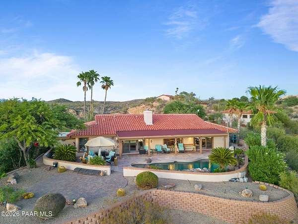 Discover this Exceptional 3-Bedroom, 2-Bathroom Home Offering 2,000 SF of Comfortable Living Space in Prestigious Rio Vista Hills. The Residence Also Includes a Dedicated Office. Property Features a Remarkable Detached Guest Quarters perfect for Additional Overnight Space. Automotive Enthusiasts will appreciate the 2-Car Attached Garage PLUS an Impressive 3-car Detached Garage and Workshop Space OR Another Stall. Property Showcases Meticulous Landscaping Maintained to Perfection, Creating an Oasis with Refreshing Heated Saltwater Pool with Breathtaking 360-degree Views. Additional amenities include Convenient Storage Shed and Secure Gated Entry. Located near Hassayampa River Preserve. This Rare Offering Combines Rural Tranquility with Modern Conveniences.