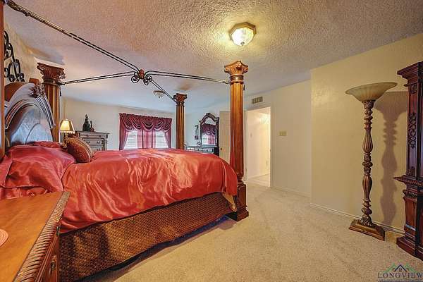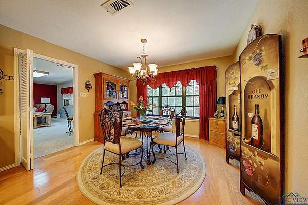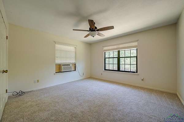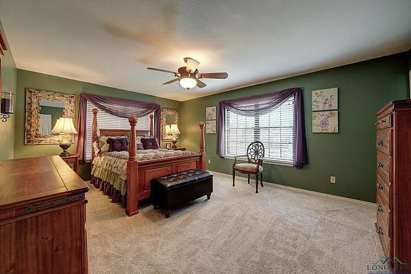 - Carpeting, Ceiling Fan, Hardwood Floors, High Ceilings, Partial Curtains