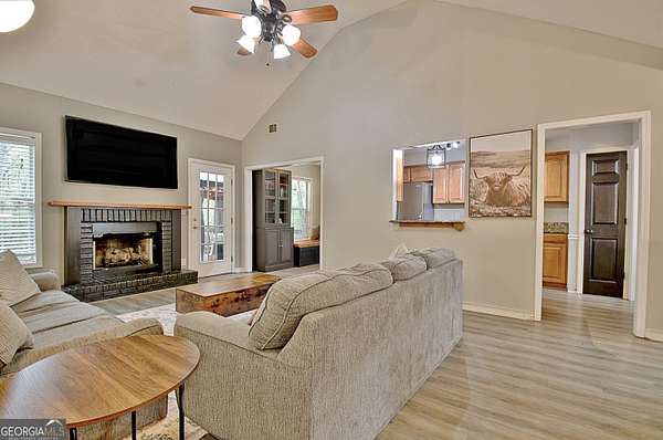 Perfectly located in the heart of Senoia, this charming home offers the best of both worlds-peaceful living on 1.8 beautiful acres and just a short golf cart ride to downtown Senoia, where you can enjoy shopping, dining, and community events! Step inside to find a spacious family room with vaulted ceilings and a brick fireplace, perfect for cozy evenings. The kitchen features custom bench seating, an oven/range combo, and plenty of cabinet space, flowing seamlessly into the formal dining room-ideal for gatherings and entertaining. The primary suite is a true retreat with a tray ceiling, walk-in closet, and an updated ensuite bath featuring double sinks, a soaking tub, and a tile shower. Two additional bedrooms and a beautifully updated hall bath with tile flooring and a modern vanity complete the main level. The finished lower level includes a laundry area, storage closet, access to the garage, and two finished rooms with windows-perfect for a home office, playroom, or optional extra bedroom. A full bath with a tub/shower combo provides added convenience for guests or family. Outside, enjoy your private wooded setting with a deck overlooking the backyard, storage shed and wooded trails leading to a creek-a nature lover's dream! This home combines comfort, versatility, and location-everything you've been looking for in Senoia living!