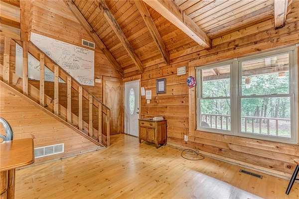 Tucked away on 6.12 peaceful acres in Rydal, this inviting log cabin offers the perfect blend of rustic charm and flexible living space. With 4 bedrooms, 3 full baths and 1 half bath , additional loft areas, there is room for everyone- whether your need space for working from home, entertaining guests, or simply relaxing. This home showcases soaring ceilings, warm wood finishes, exposed wooden beams and windows that frame the stunning view of Pine Log Mountain. The main level offers a kitchen, living room, dining area, bedroom and 1 and half baths. Upstairs offers oversized master suite with 2 walk-in closets, separate tub and soaking tub with double vanity and 2 additional bedrooms and a bath. Whether you're dreaming of a quiet homestead or a weekend escape from the city, this property delivers privacy, beauty, and endless potential. Schedule your tour today and see what make this one-of-a-kind property so special.