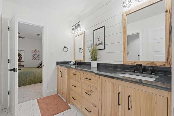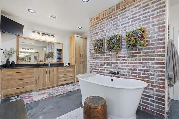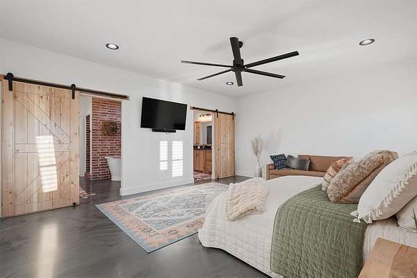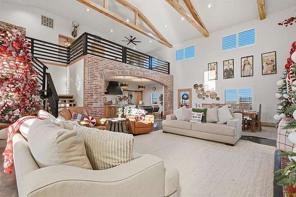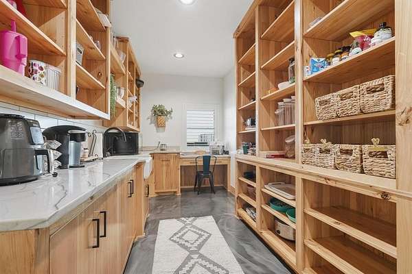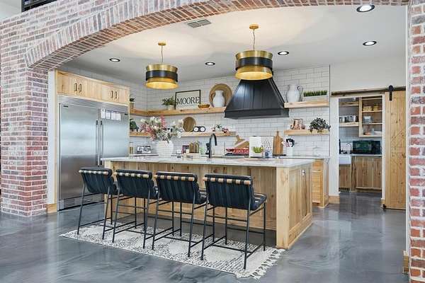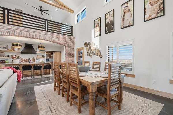Welcome to your Texas dream home, a private gated entrance where luxury meets wide open spaces on 3.43 acres of pristine TifTuf Bermuda grass, fully irrigated by well water. This 5 bedroom, 3.5 bathroom custom home is designed with impeccable craftsmanship and no detail overlooked. Step inside to a split open floor plan featuring gunmetal metallic epoxy flooring and a 26 foot floor to ceiling wood-burning fireplace, creating a warm and inviting atmosphere. The kitchen offers top of the line appliances, custom Rustic Hickory cabinetry, and Quartz countertops. A spacious butler's pantry offers additional storage, counter space, and a prep sink. The mudroom is thoughtfully designed with six built in cubbies, seamlessly connected to a laundry room equipped with double washers and dryers for a busy household. Retreat to the primary suite, a private oasis featuring an oversized soaking tub, a stylish walkthrough shower, dual vanities, and a spacious walk in closet. The home gym, located above the primary suite, includes rubber gym flooring and a padded turf run. Upstairs, the home office loft comes with custom built ins, while the kids living room connects four equal sized bedrooms with two Jack and Jill bathrooms. Outdoor living is unparalleled, featuring a custom outdoor kitchen with dual stovetops, a pellet grill, Santa Maria grill, sink, refrigerator, and warming drawer. The in ground heated pool and hot tub include tanning ledges on both ends, an automatic pool cover, and a self cleaning pool sweep all conveniently controlled from your phone. Plus, a half bath is easily accessible from the covered back porch, providing convenience for poolside guests. Adding even more value to this incredible property is a 30x50 shop with electricity and an automatic 12 foot door, perfect for storage, hobbies, or a workshop setup.